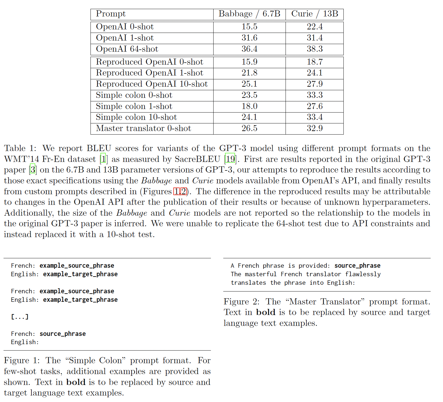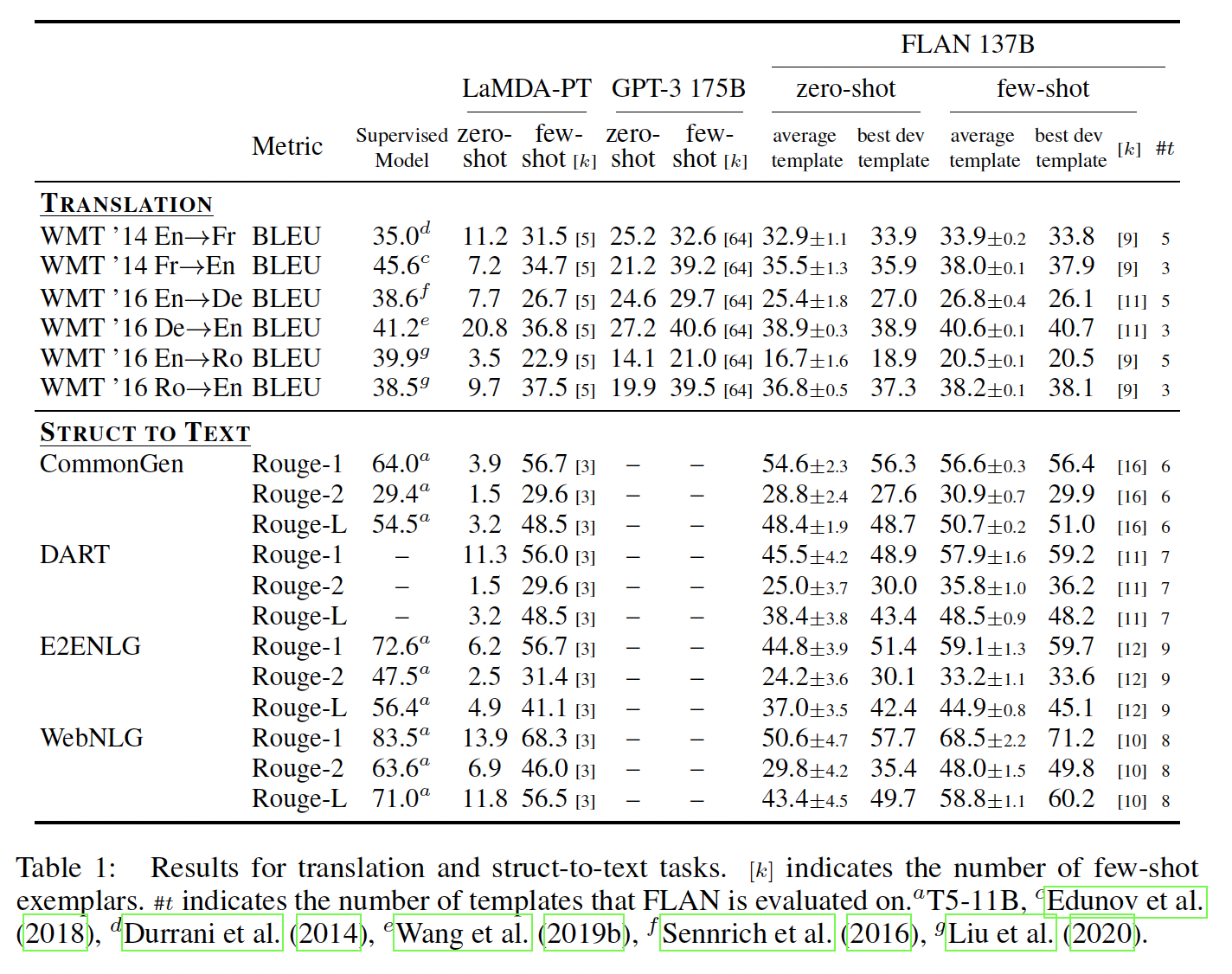 翻译:类似于 GPT-3 ,LaMDA-PT 的训练数据约有 90% 是英语,并包含一些其他语言的文本,这些文本并不是专门用来训练机器翻译的。我们还在 GPT-3 论文中评估的三个数据集上评估 FLAN 的机器翻译性能:WMT'14 的 French–English 数据集,以及 WMT'16 的 German-English 数据集和 Romanian–English 数据集。