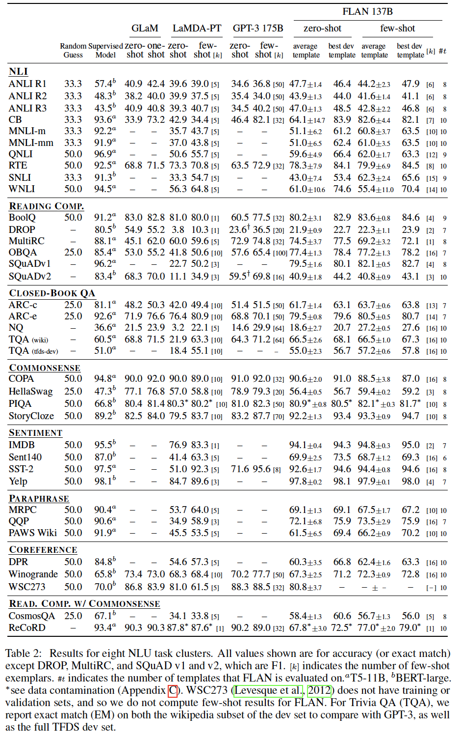 我们在自然语言推理、阅读理解、闭卷问答、翻译、常识推理、共指消解、以及 struct-to-text 等任务上评估了 FLAN 。如前所述,我们通过将数据集分组为 task clusters ,并 hold out 每个 cluster 以供评估,同时在其他所有 task clusters 上进行指令微调(即每个 evaluation task cluster 使用不同的 checkpoint )。对于每个数据集,我们评估所有模板的性能均值,这代表了在典型自然语言指令下的期望性能。由于有时可以使用验证集进行 manual prompt engineering (GPT-3 ),对于每个数据集,我们还使用在验证集上性能最佳的模板来获得测试集性能。