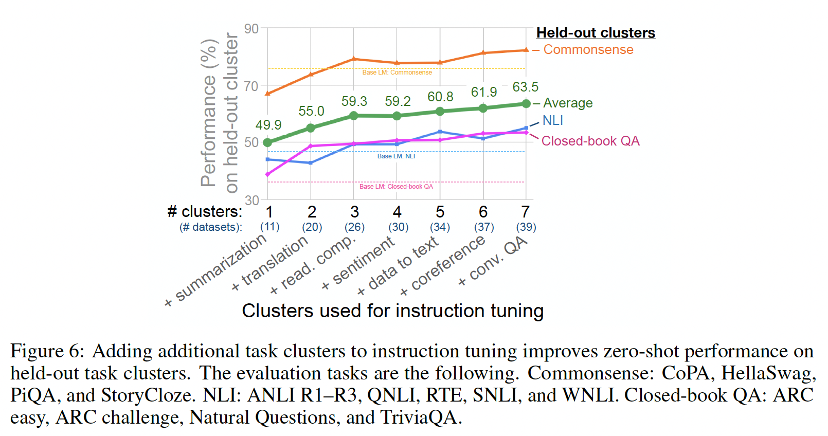 此外,有趣的是,在我们测试的七个 task clusters 中,性能似乎没有达到饱和状态,这意味着通过添加更多 task clusters 到指令微调中,性能可能会进一步提高。