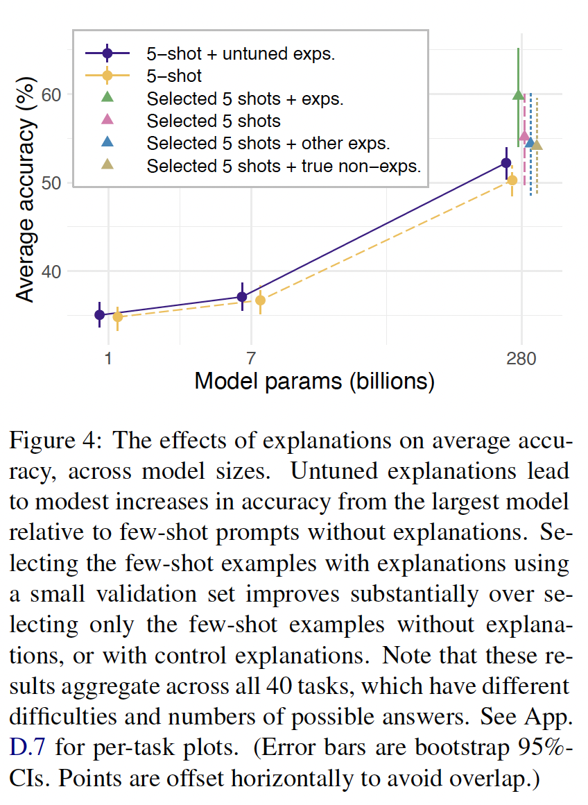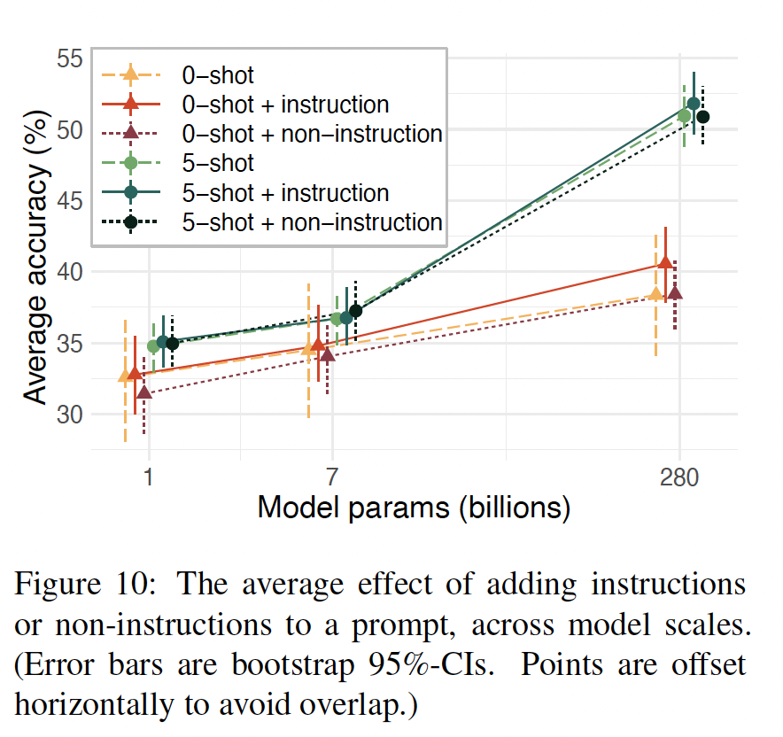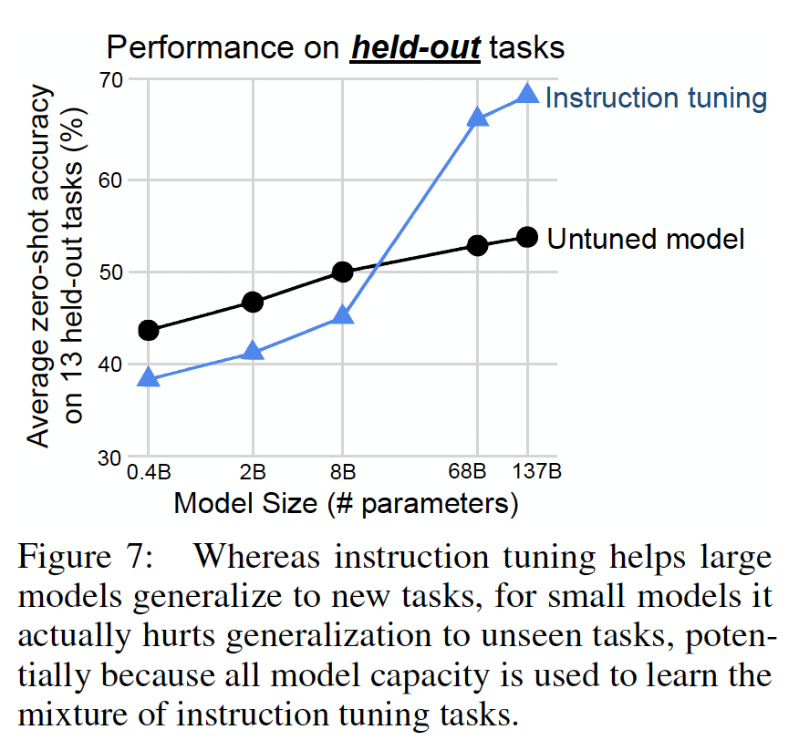 然而,对于 8B 及更小规模的模型,在 held-out tasks 上的表现却令人深思:指导微调实际上对 held-out tasks 的性能产生了负面影响。对于这一结果,一个可能的解释是对于小规模模型来说,在指令微调过程中学习的 40 个任务填满了整个模型容量,导致这些模型在新任务上的表现较差。根据这一潜在解释,对于更大规模的模型,指令微调填满了部分模型容量,同时教会这些模型如何遵循指令,使它们能够利用剩余容量来泛化到新任务上。