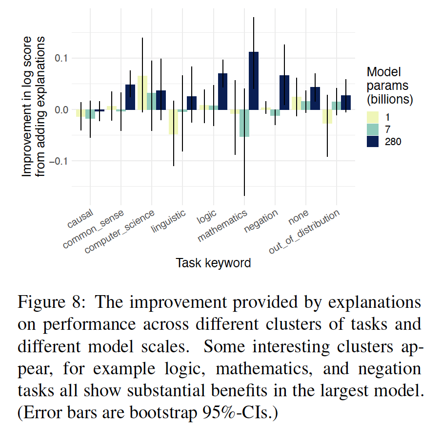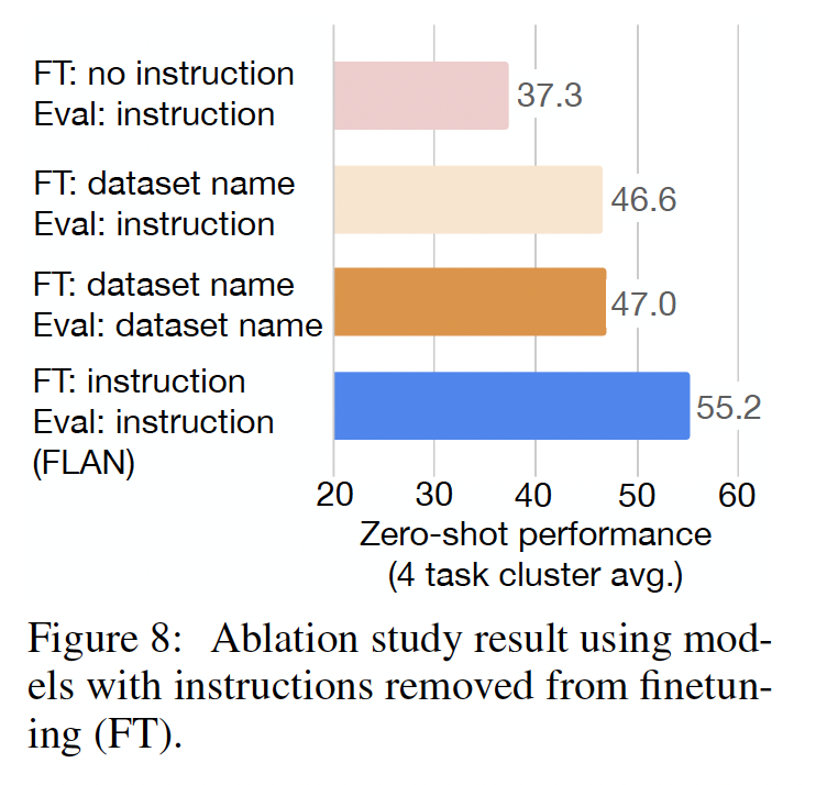 Figure 8 显示了结果:这两种消融配置的性能都显著低于 FLAN ,这表明在处理 unseen 任务的 zero-shot 性能中,使用指令是至关重要的。