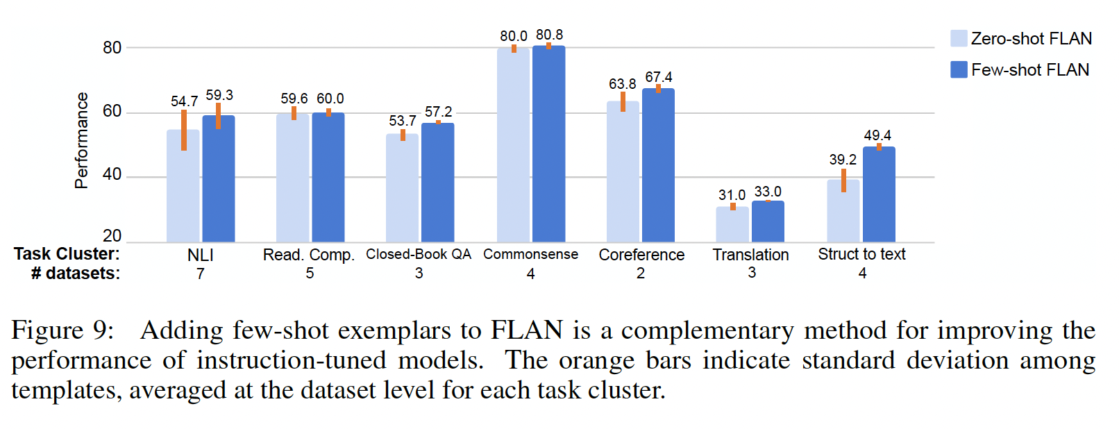 如 Figure 9 所示,与zero-shot FLAN 相比,few-shot 示例改善了所有 task clusters 的性能。示例对于输出空间较大/复杂的任务特别有效,例如 struct-to-text 、翻译、以及闭卷问答,这可能是因为示例有助于模型更好地理解输出格式。此外,对于所有task clusters ,few-shot FLAN 的标准差较低,表明对 prompt engineering 的敏感性降低了。