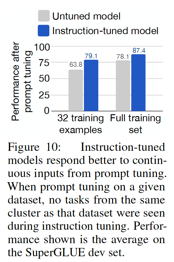 指令微调促进 prompt tuning:根据我们之前观察到的指令微调改善了模型对指令的响应能力的情况,我们可以得出这样的结论:如果 FLAN 更顺从地执行 NLP 任务,那么当使用 soft prompts (放在输入之前的连续变量,这些变量通过 prompt tuning 进行优化)进行推理时,它也应该表现出更好的性能。作为进一步的分析,我们根据前面的 cluster splits ,为每个 SuperGLUE 任务训练continuous prompts ,以便在对任务 prompt-tuning 时,指令微调过程中没有看到与 cluster 的任务。我们的 prompt setting 设置遵循 《The power of scale for parameter-efficient prompt tuning》 的过程,只是我们使用了长度为 10 的prompt ,权重衰减为 1e-4 ,并且在注意力分数上没有使用 dropout ;我们在初步实验中发现,这些改变提高了 LaMDA-PT 的性能。
