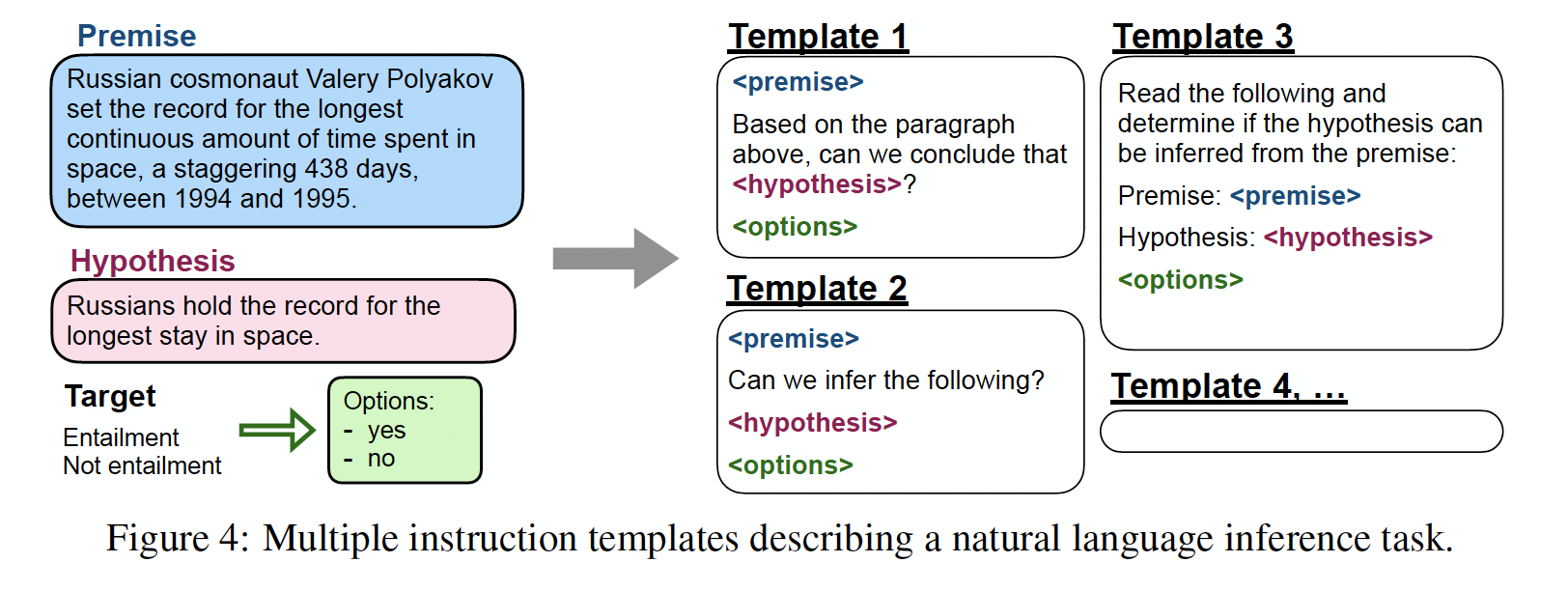 对于每个数据集,我们手动编写了十个 unique 的模板,这些模板使用自然语言指令来描述该数据集的任务。尽管十个模板的大部分都描述了原始任务,为了增加多样性,对于每个数据集,我们还包括最多三个 "turned the task around" 的模板(例如,对于情感分类,我们包括了要求生成电影评论的模板)。然后,我们对 pretrained 语言模型在所有数据集的混合体上进行指令微调,每个数据集中的样本都按照该数据集的随机选择的指令模板进行格式化。 Figure 4 展示了一个自然语言推理数据集的多个指令模板。