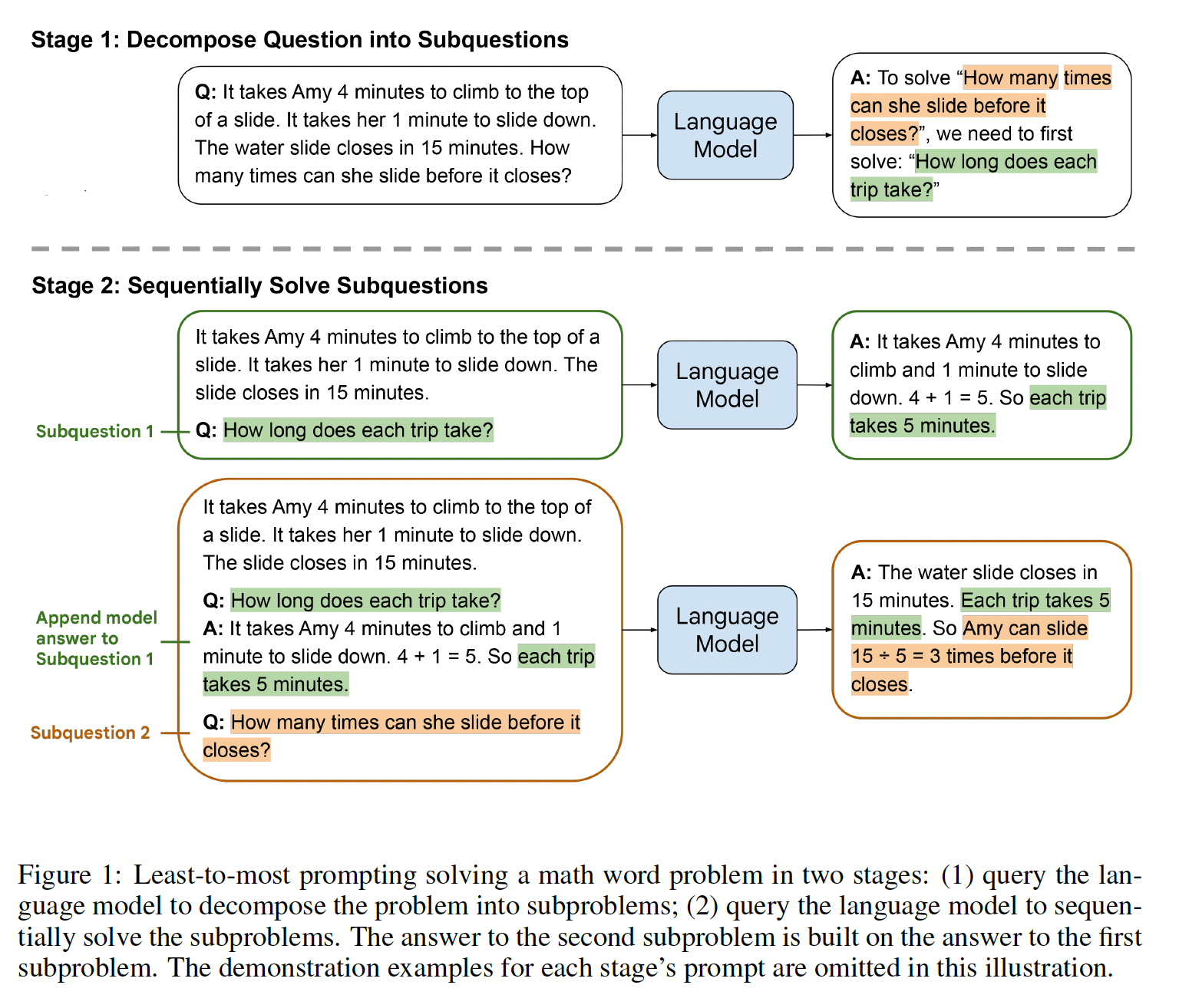 least-to-most prompting 教导语言模型如何通过将一个复杂的问题分解为一系列较简单的子问题来解决。它由两个连续的阶段组成: