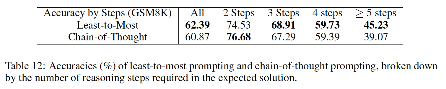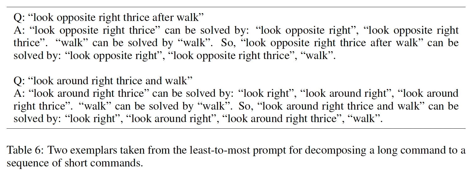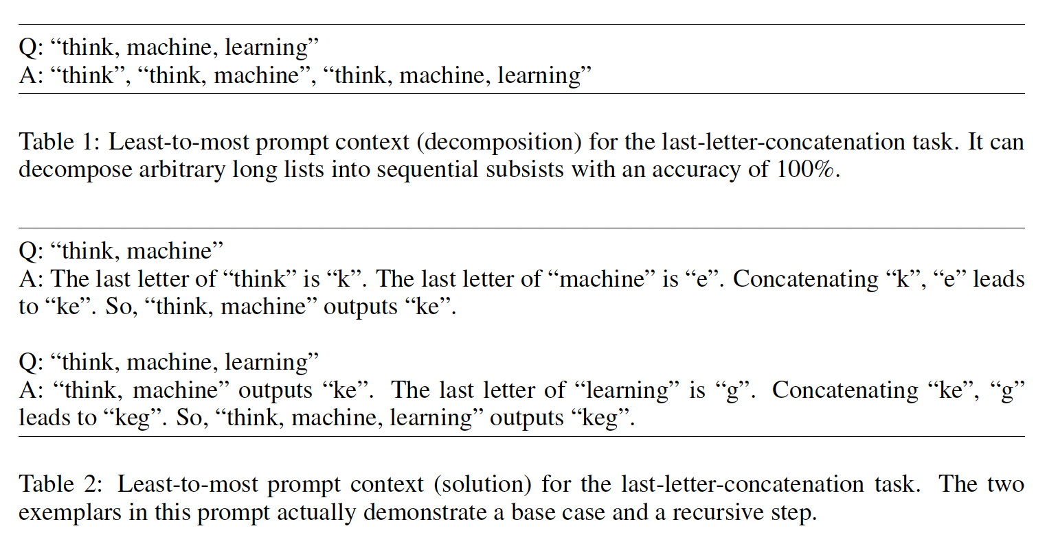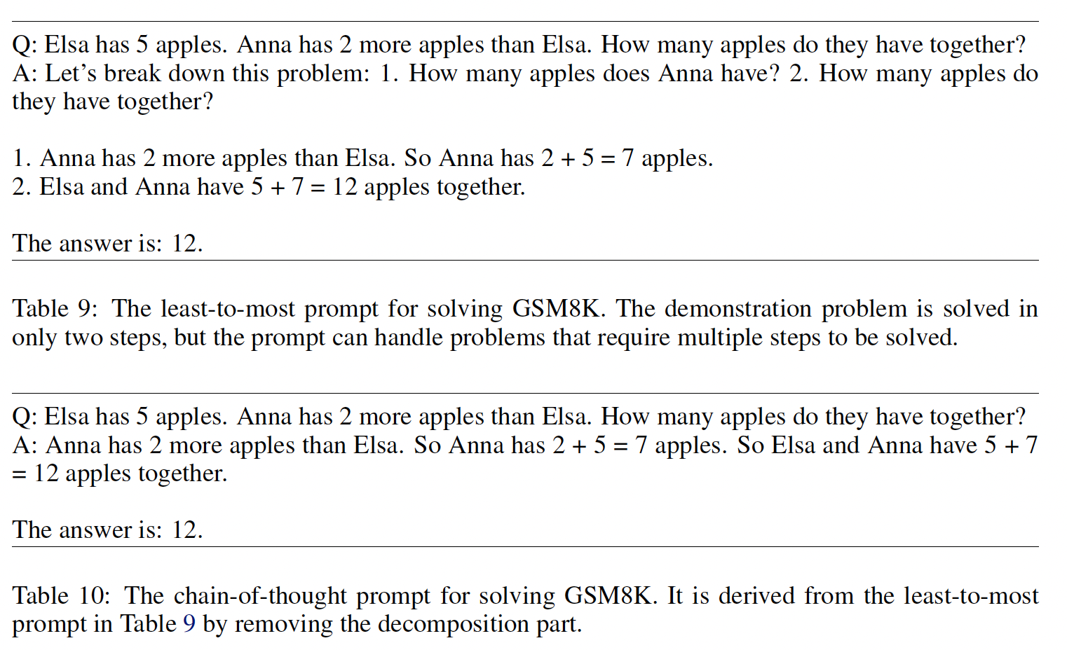 Least-to-most prompting :Table 1 展示了任务分解阶段,Table 2 展示了子问题的解决阶段。