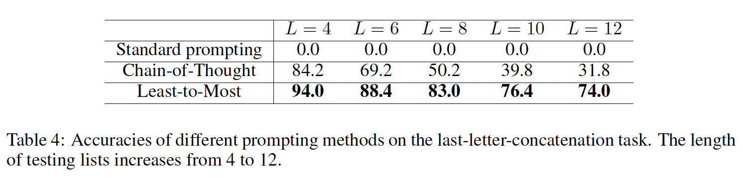 当测试列表与 prompt exemplars 中的列表具有相同的长度时,chain-of-thought prompting 做得很完美。然而,当测试列表比 prompt exemplars 中的列表长很多时,它的表现就很差。我们表明,least-to-most prompting 克服了这一限制,在长度泛化方面明显优于 chain-of-thought prompting 。