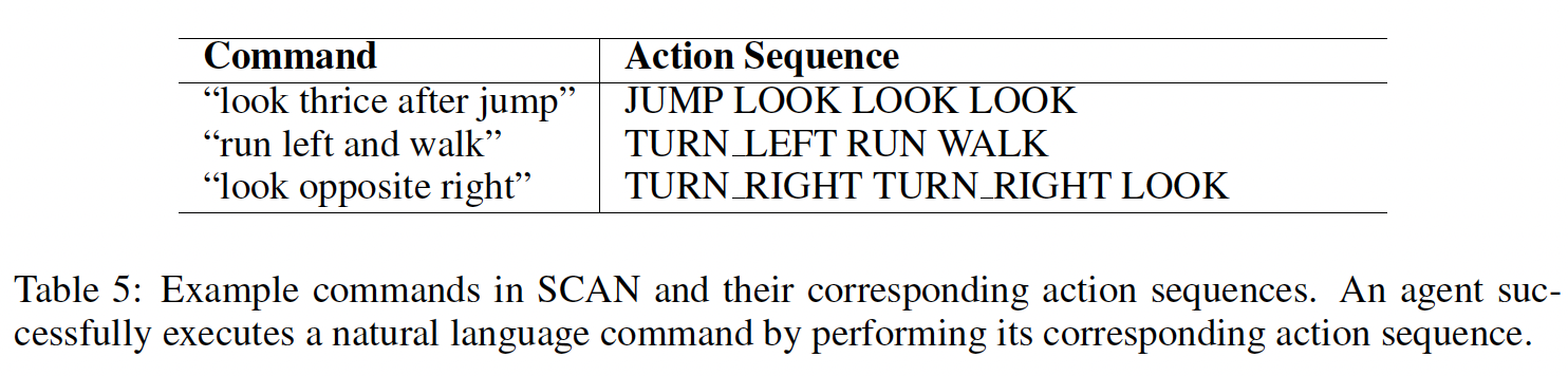 任务:SCAN ,它需要将自然语言命令映射到动作序列,如下表所示。