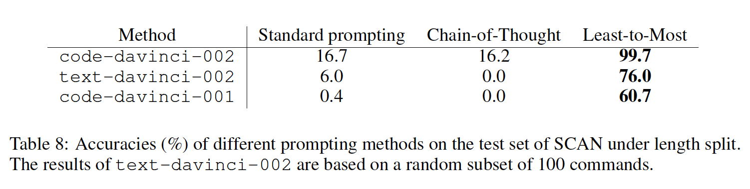 compositional generalization:SCAN是一个广泛使用的基准,用于评估组合泛化。在其所有的 split 中,最具挑战性的是length split ,它要求模型泛化到比训练序列更长的测试序列。之前在 SCAN 上有良好表现的工作大多提出了神经符号(neural-symbolic )架构和语法归纳(grammar induction )技术。与现有的工作不同,我们证明,没有专门设计的模型架构和符号组件来提高 compositional generalization 能力, least-to-most prompting 在任何 split (包括 length split )上都能达到 99.7% 的准确率,只需要少量的 demonstration examples ,而且不需要任何训练或微调。