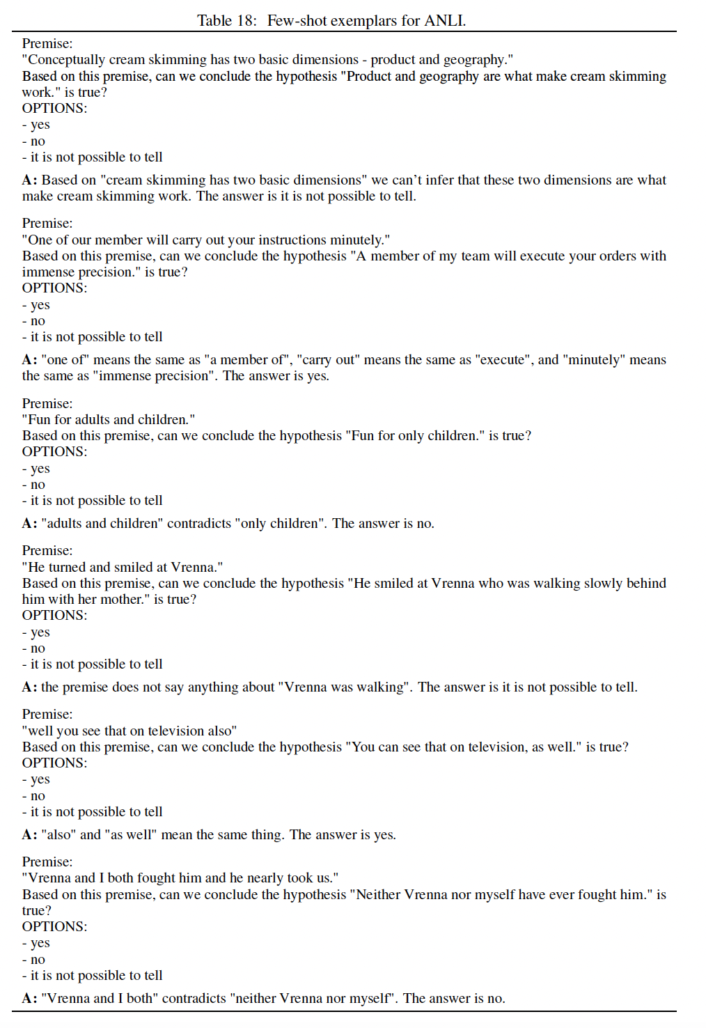 自然语言推理(NLI):在五个 NLI 数据集上, FLAN 的性能远远超过所有基准模型。正如 GPT-3 原始论文所指出的,GPT-3 在NLI 上表现不佳的原因之一可能是 NLI 的样本在无监督训练集中不太可能以自然方式出现,因此以作为句子续写的方式表达起来会很别扭。对于 FLAN ,我们将 NLI 表述为更自然的问题形式:"Does <premise> mean that <hypothesis>?" 从而获得了更高的性能。