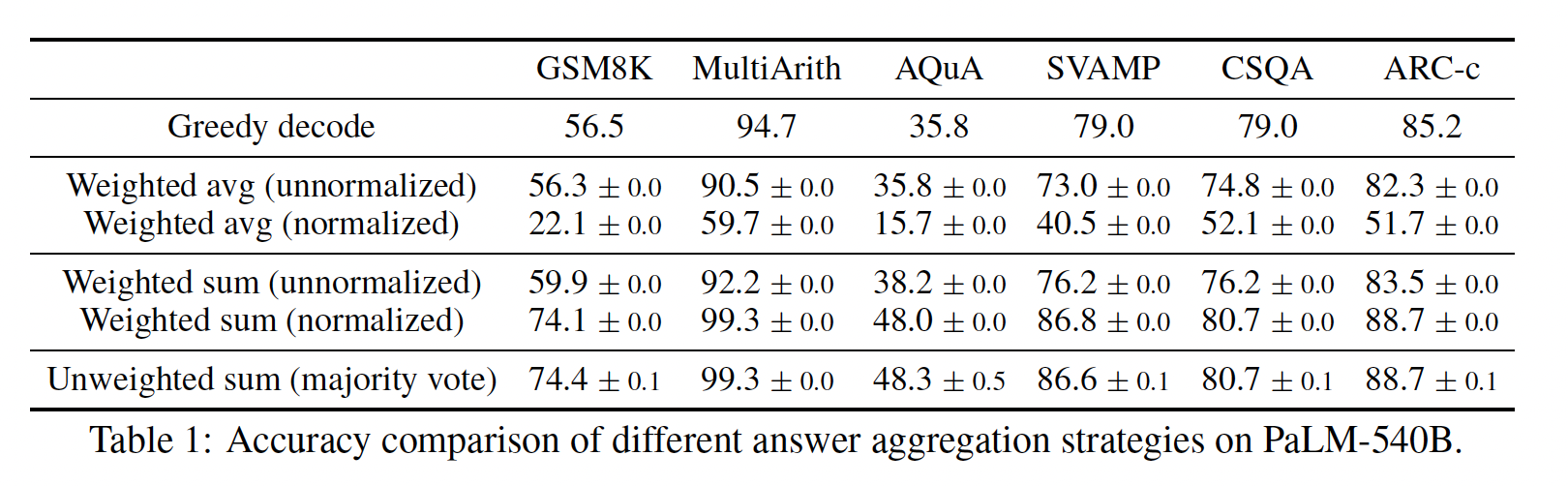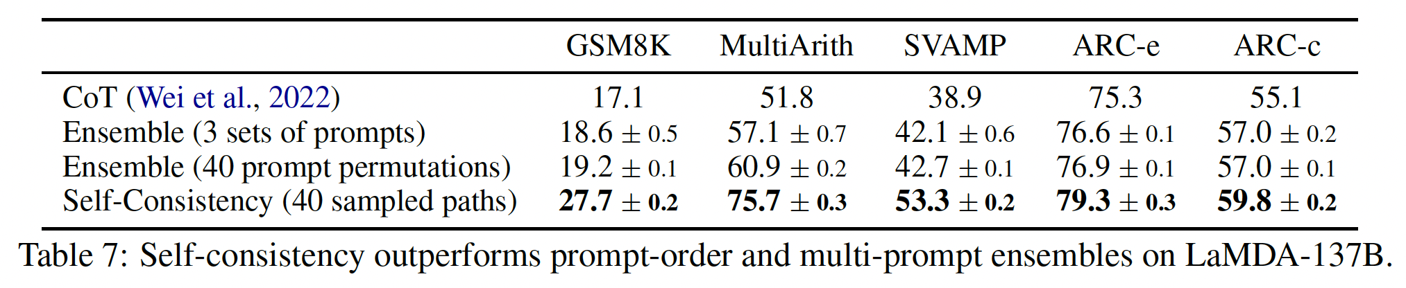 实现:除非另有说明,我们使用 text-davinci-002 版本的 GPT-3 175B 。我们选择这个 LLM 是因为它在 public LLM 中具有最强的 CoT reasoning 性能,如 《Large language models are zero-shot reasoners》 和 《Chain of thought prompting elicits reasoning in large language models》 的报告。我们还评估了 Codex 模型(code-davinci-002 )作为 LLM 。遵从 《Chain of thought prompting elicits reasoning in large language models》 ,除了 AQuA 和 Letter (CSQA(StrategyQA(demonstrations 数量