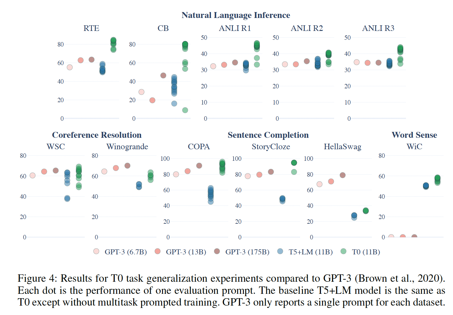 T0 以与我们类似的设置对 T5 进行微调,发现 zero-shot learning 在具有 11B 参数的模型中可以得到改善。