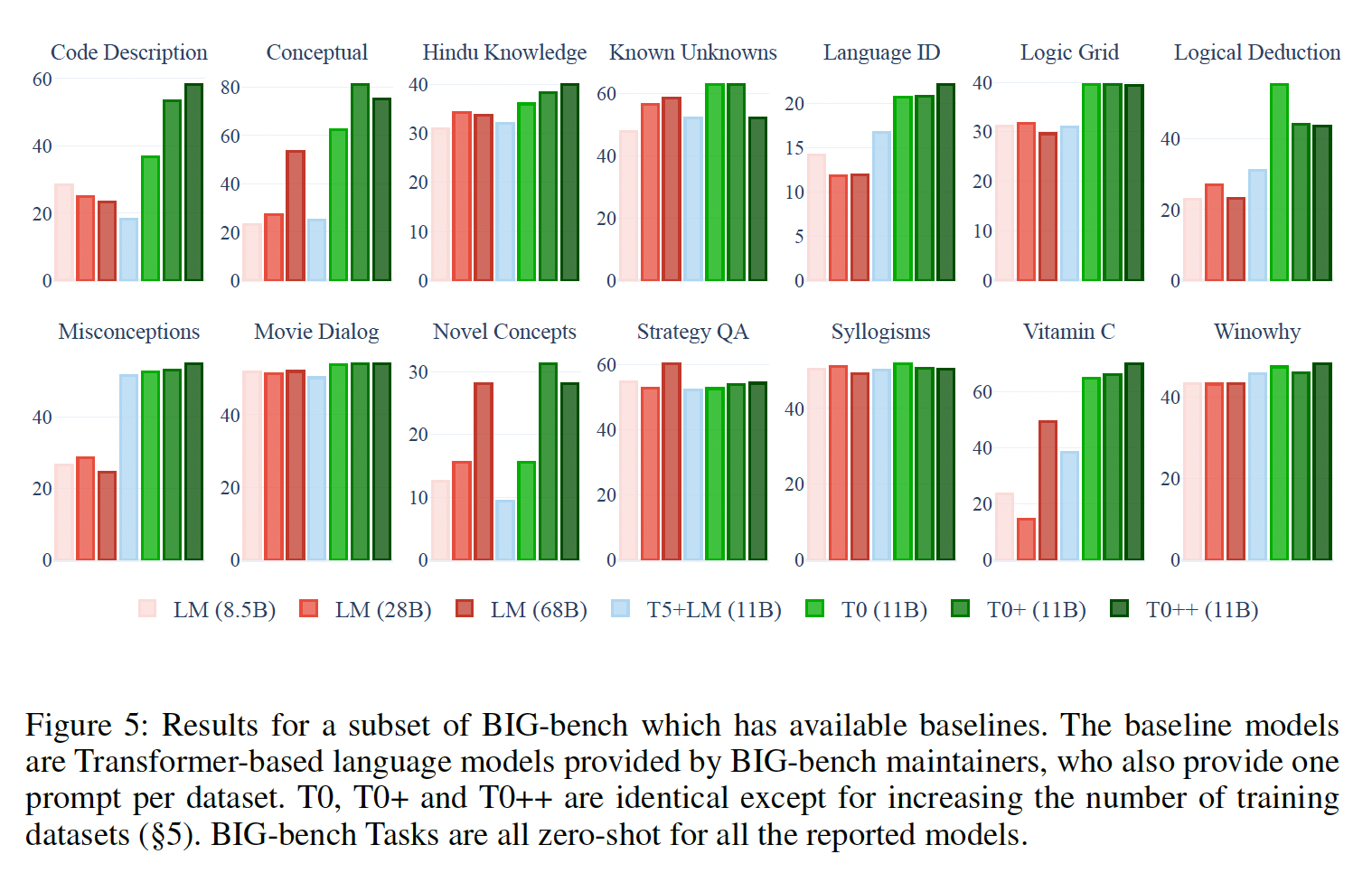 对于第一个问题,我们发现多任务训练能够实现 zero-shot task generalization ,我们的模型在 11 个 held-out datasets 中的 9 个数据集上与 GPT-3 的性能相匹配或超过,尽管它比 GPT-3 小 16 倍。我们还表明,在 BIG-bench 基准的 14 个任务中,该模型在 13 个任务上比大型 baseline 语言模型有提高。