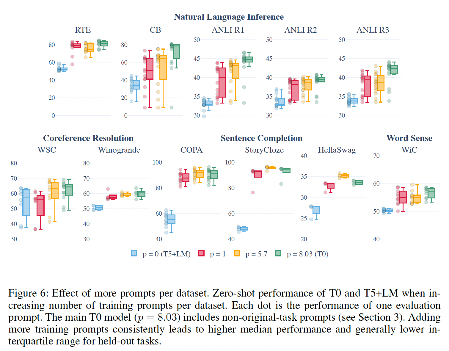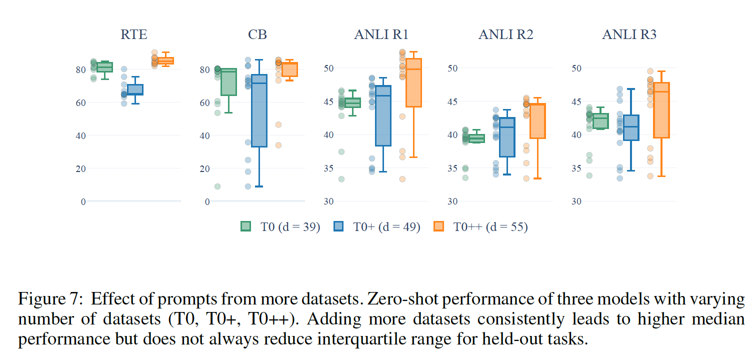 对于第二个问题,我们发现,在每个数据集上训练更多的 prompts ,可以持续地提高中位数,并减少在 held-out tasks 上的性能方差。对来自更多数据集的 prompts 进行训练也普遍提高了中位数,但并没有一致地降低方差。