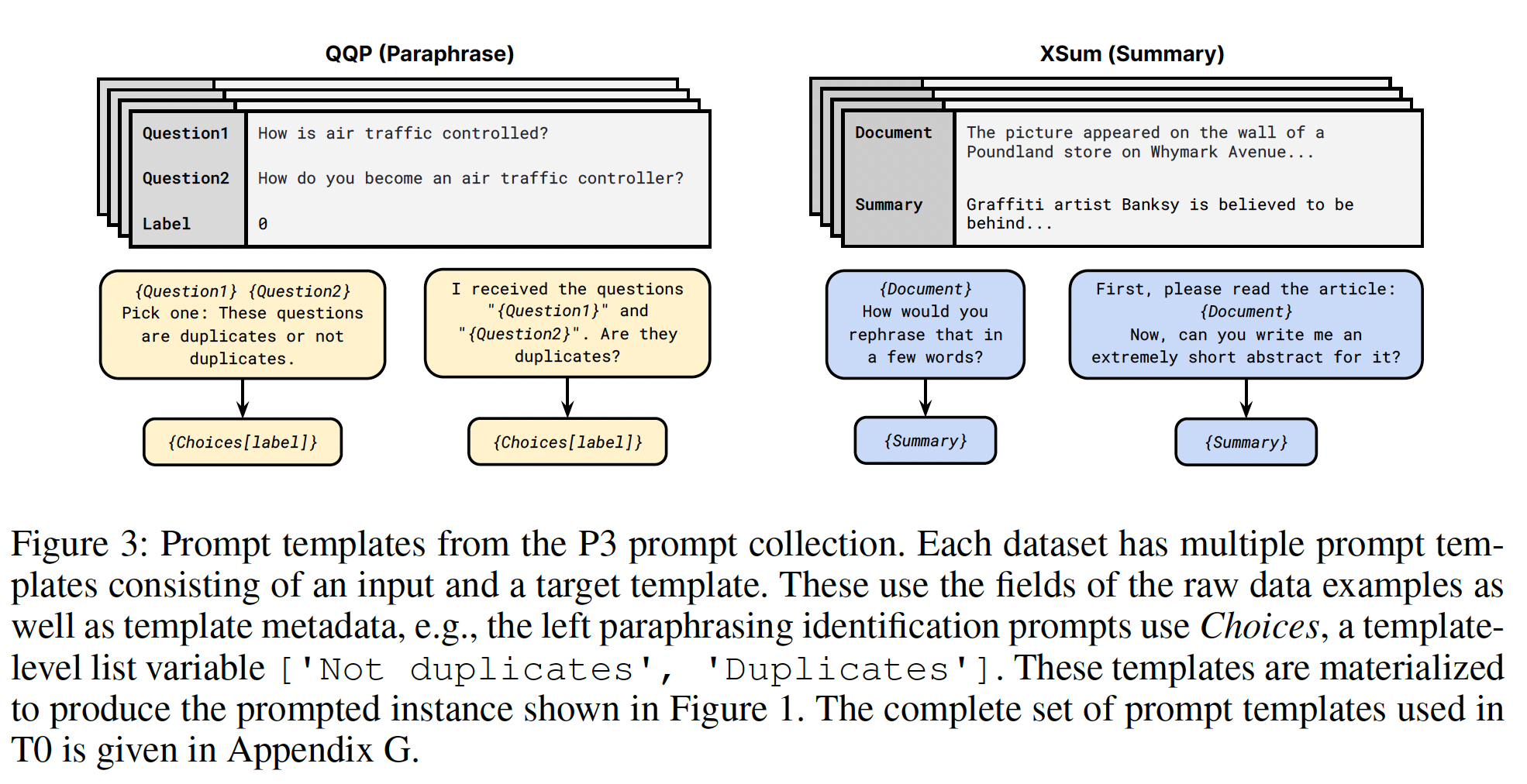 在本文中,我们专注于以有监督的和大规模多任务的方式显式地训练语言模型。我们的方法是使用由自然语言的 prompts 中指定的一组不同任务组成的 training mixture 。我们的目标是:诱导模型在不需要大规模的情况下更好地泛化到 held-out tasks ,以及对 prompts 的措辞选择更加鲁棒。为了将大量的自然语言任务转换成 prompted 形式,我们为结构化的数据集使用了一种简单的模板语言。我们开发了一个接口从而从公共贡献者那里收集 prompt ,促进了 large multitask mixture with multiple prompts per dataset 的收集(《Promptsource: An integrated development environment and repository for natural language prompts》)。然后,我们在任务的一个子集上训练 T5 encoder-decoder model 的变体(T5、《The power of scale for parameter-efficient prompttuning》),然后在未被模型训练的任务和 prompts 上评估模型。