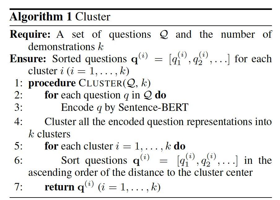Demonstration Sampling 算法如下所示。在对所有 clusters 进行 demonstration sampling 后,将有 demonstrations demonstrations 被用来 augment 一个测试问题 in-context learning 。具体而言,输入是所有demonstrations LLM 从而获得 reasoning chain ,最后是答案(Figure 4 的右边)。