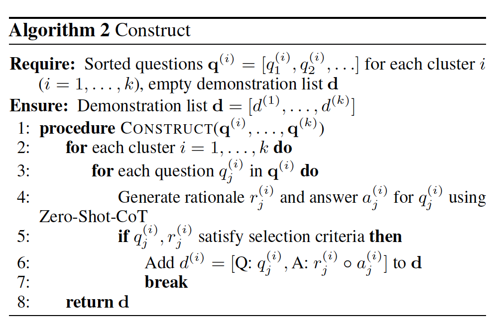 demonstration sampling :从每个 cluster 中选择一个有代表性的问题,并使用简单启发式的 Zero-Shot-CoT 生成其 reasoning chain 。