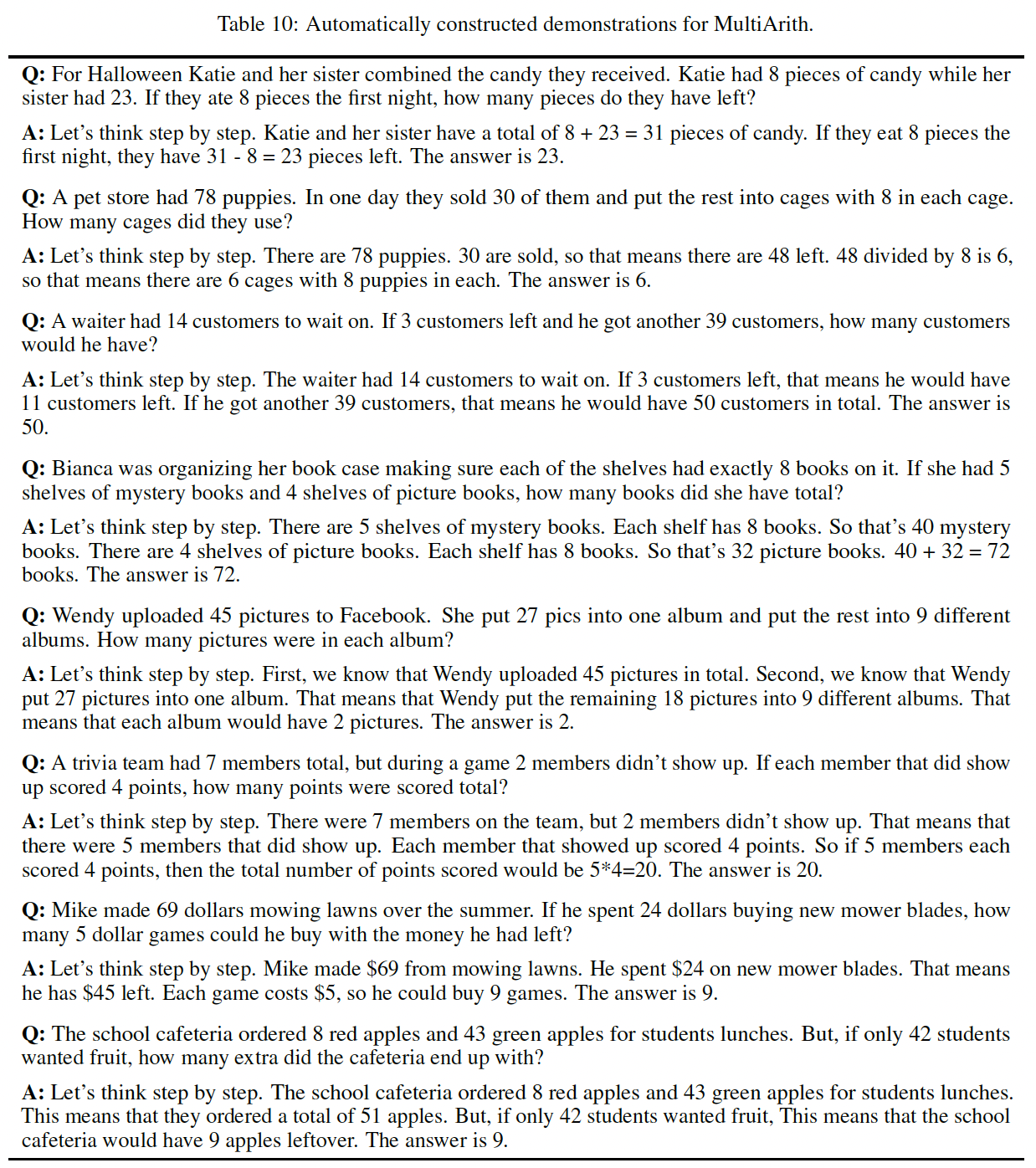我们在附录D 中介绍了 Auto-CoT 的 constructed demonstrations 。其中 MultiArith 的 demonstrations 如下: