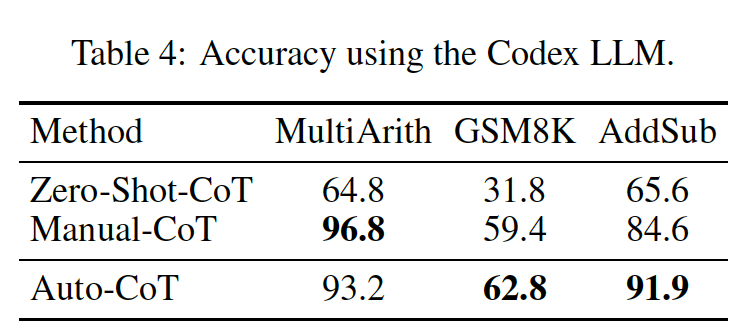 使用 Codex LLM 的有效性:为了评估使用不同 LLM 的 Auto-CoT 的有效性,这里我们将 LLM 改为 Codex 模型。如下表所示,与使用 GPT-3 (text-davinci-002) LLM 的 Table 3 相比,Codex LLM 导致 Manual-CoT 的性能提高。尽管如此,使用 Codex LLM ,Auto-CoT 的整体性能与 Manual-CoT 相比仍然具有竞争力,为 Auto-CoT 的有效性提供了额外的经验证据。