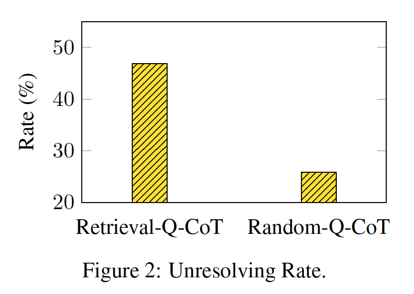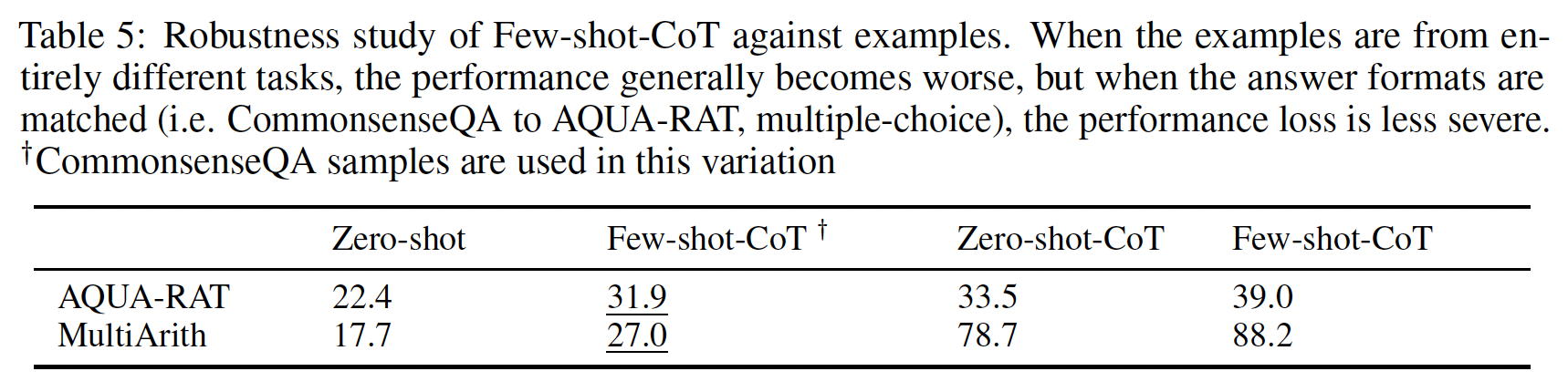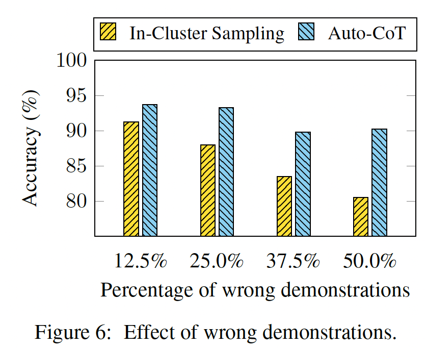 Wrong Demonstrations 的效果:回顾我们在前面的讨论,可能存在 wrong demonstrations (其答案是错误的)。为了了解多样性是否能减轻这种影响,我们设计了 In-Cluster Sampling baseline ,通过从与 test question 的同一 cluster 中随机采样问题来构建 demonstrations 。下图比较了在 MultiArith 上不同数量的 wrong demonstrations 的准确率。与 In-Cluster Sampling 相比,Auto-CoT(使用 diversity-based clustering)受 wrong demonstrations 的影响较小:即使遇到 50% 的 wrong demonstrations ,其性能也没有明显下降。