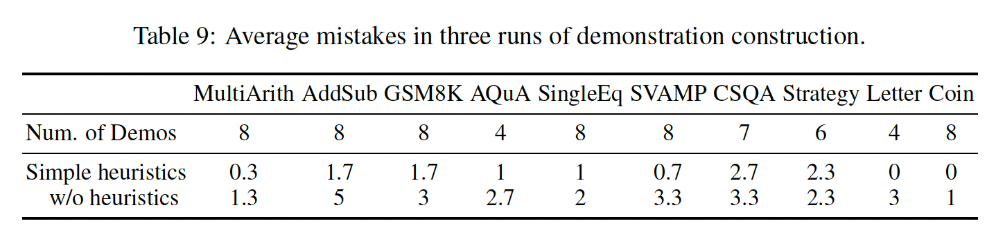 与 《Chain of thought prompting elicits reasoning in large language models》 中手工制作 demonstrations 的 criteria 类似,我们的 selection criteria 遵循简单的启发式方法,从而鼓励来采样较简单的问题和理由:对于 demonstration 60 tokens 、理由 5 reasoning steps ,则选中该 demonstration 并记做