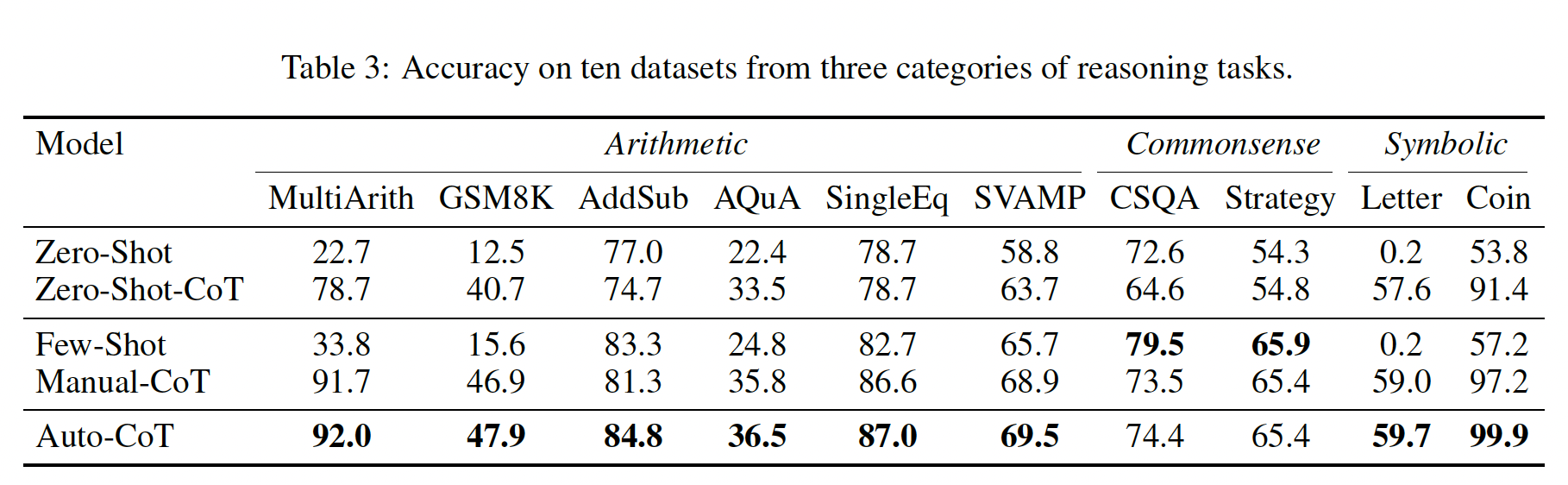 Auto-CoT 在十个数据集上的有竞争力的表现:下表比较了三类推理任务的十个数据集的准确率。