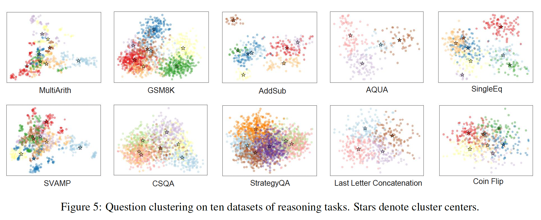 更具体而言,我们为每个 cluster demonstration cluster selection criteria 。换句话说,更接近 cluster cluster prompted input 被表述为: [P] 是一个单个 prompt "Let’s think step to step "。这个构造好的输入被馈入一个使用 Zero-Shot-CoT 的 LLM,从而输出由理由 reasoning chain 。然后,通过拼接问题、理由、以及答案,构建第 cluster 的候选 demonstration