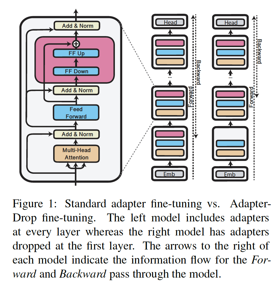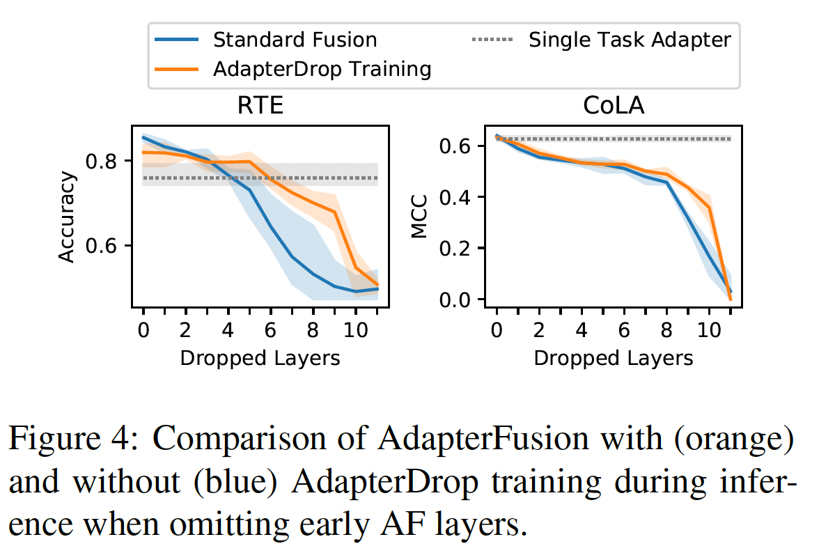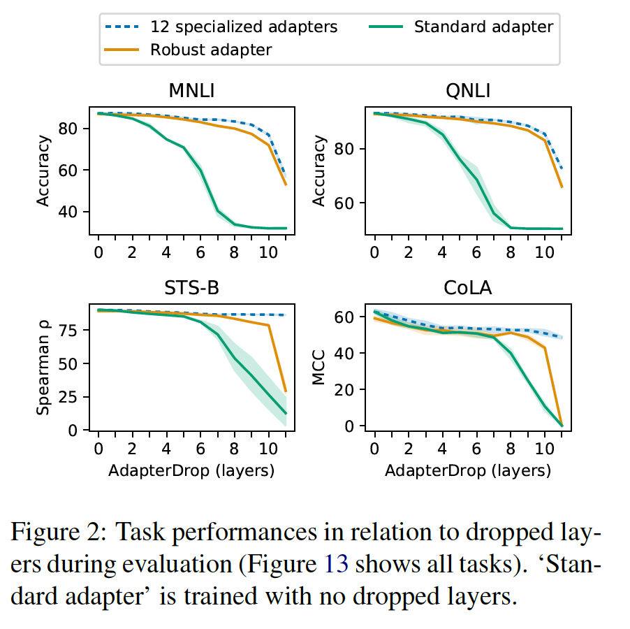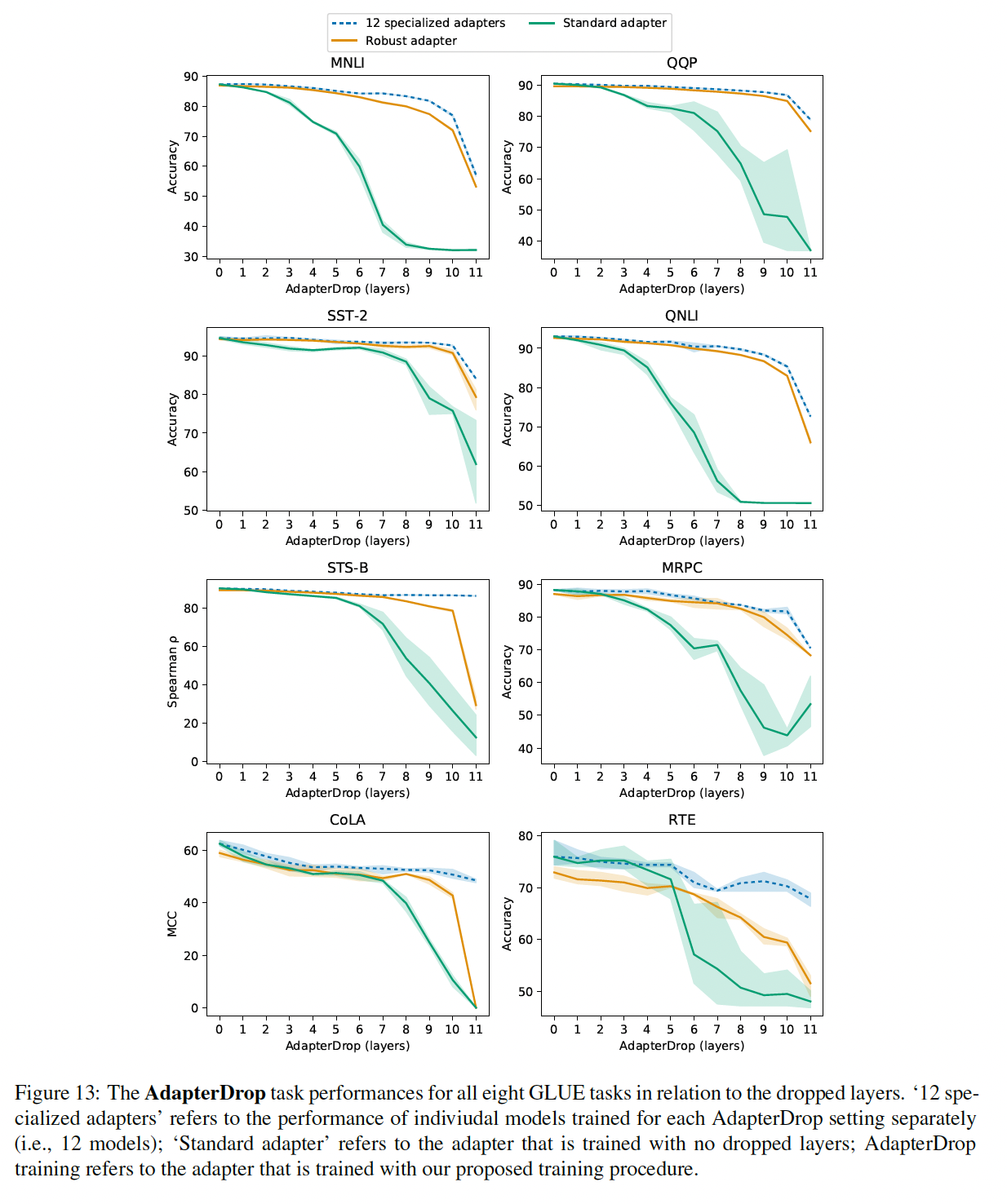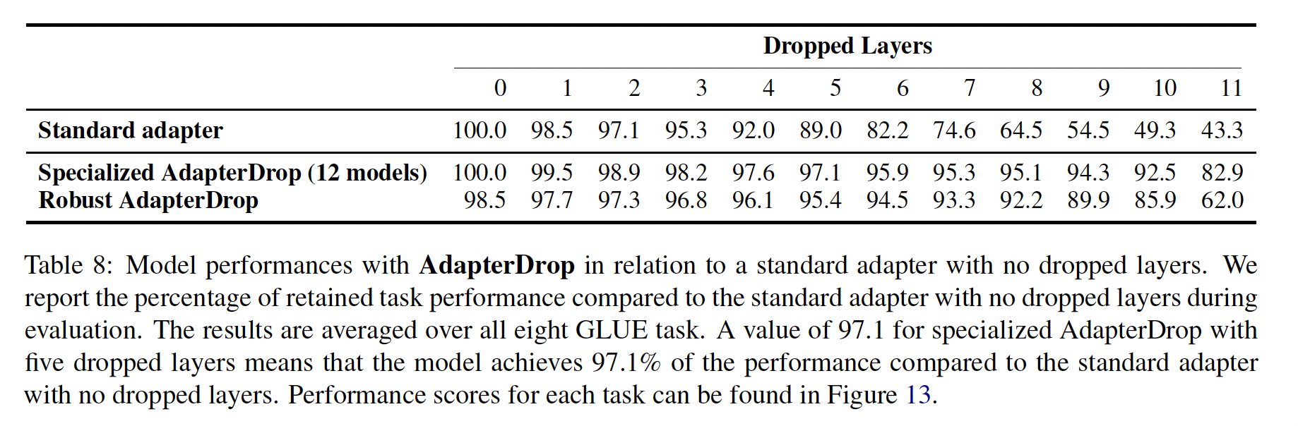 我们还包括另一个基线 AdapterDrop (《Adapterdrop: On the efficiency of adapters in transfor》),它删除一些 adapter layers 以获得更高的效率,记做
