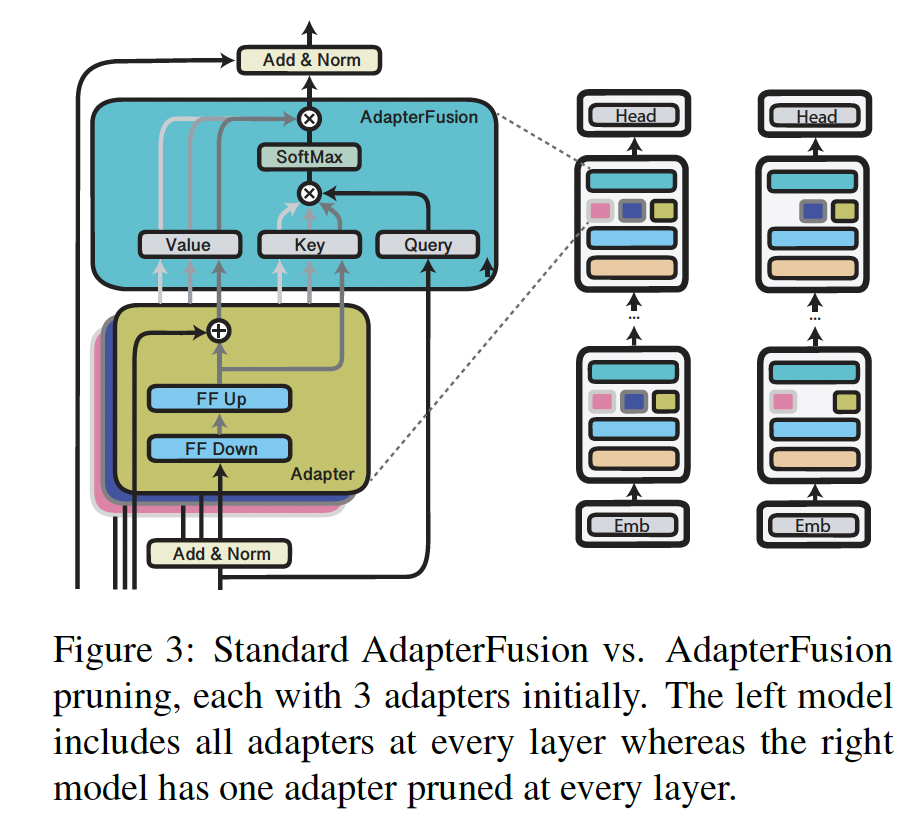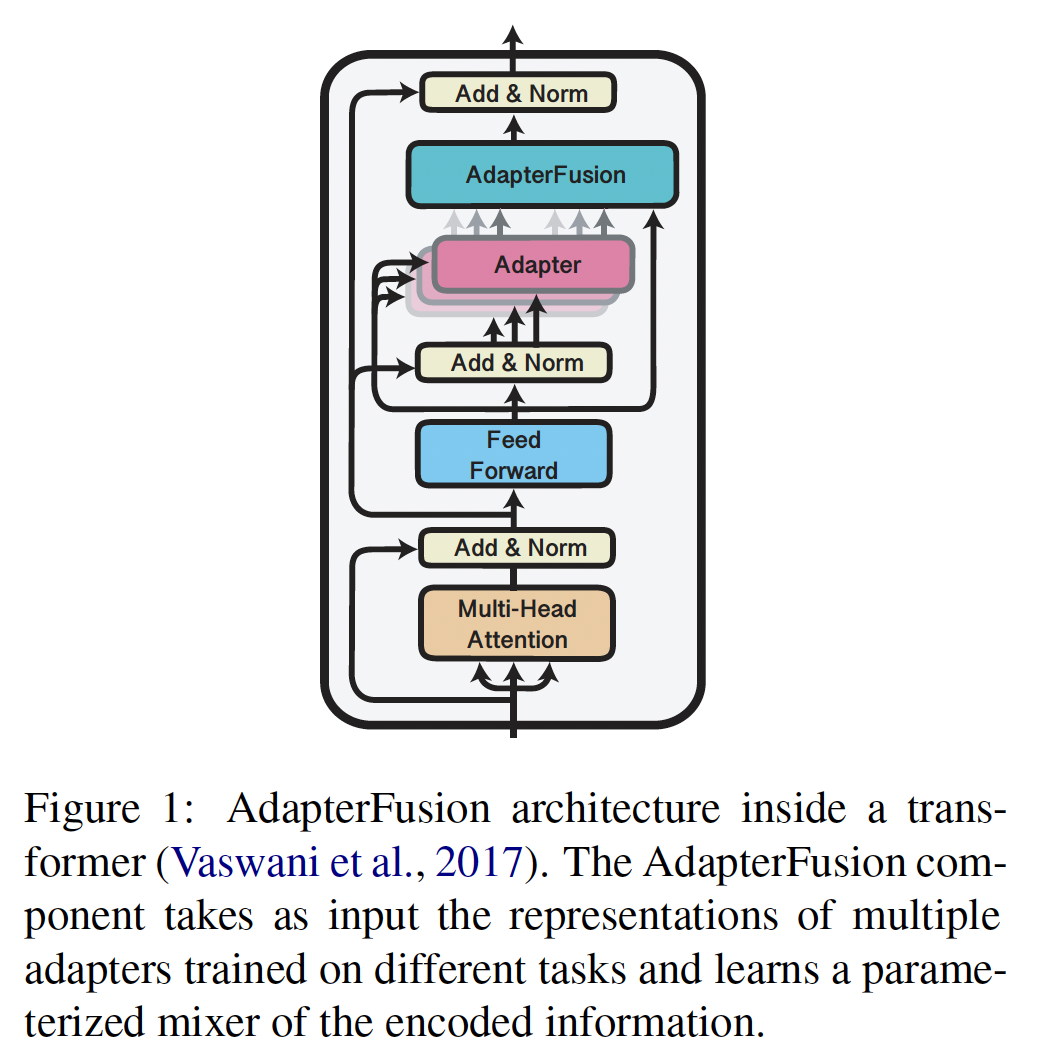 《AdapterFusion: Non-destructive task composition for transfer learning》 (Figure 3b):在每个 transformer layer 中包含一个 adapters 。
