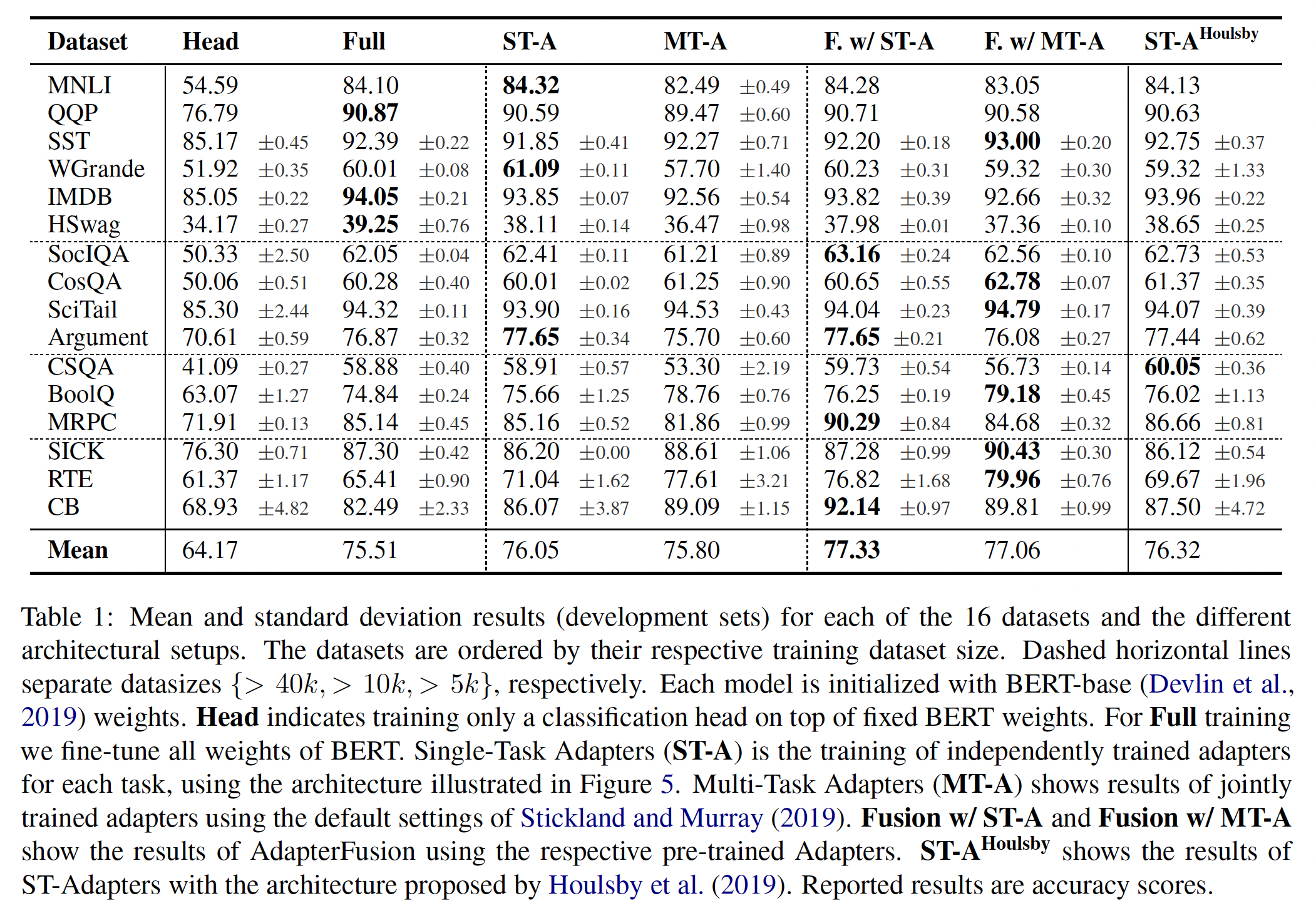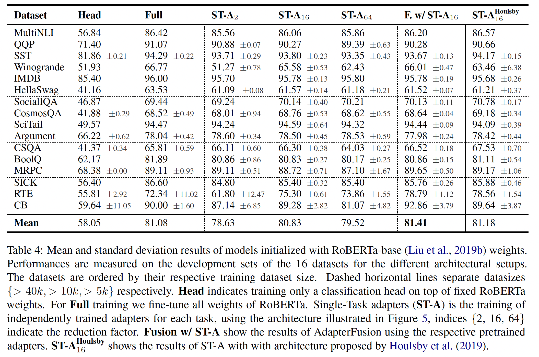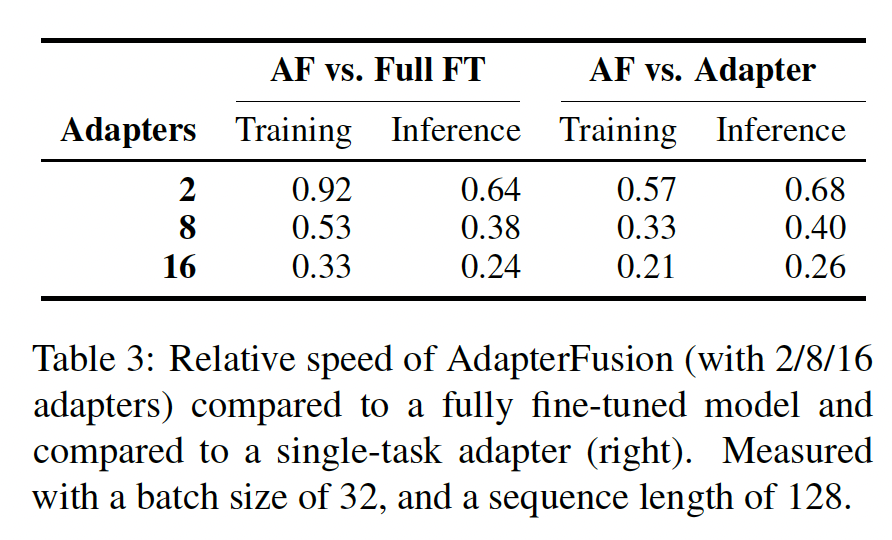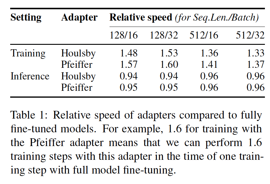 《Parameter-efficient transfer learning for NLP》 的 adapters 具有更大的容量(因为有两个 adapters),但训练和推理速度更慢。我们发现,对于所有设置,三种模型架构在性能方面没有很大差异,证明了训练 adapters 是实现下游任务 SOTA 性能的合适和轻量级替代方案。