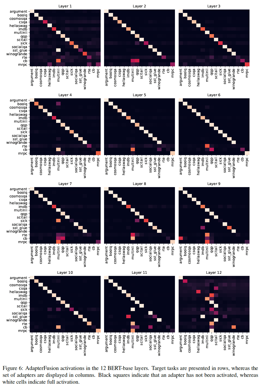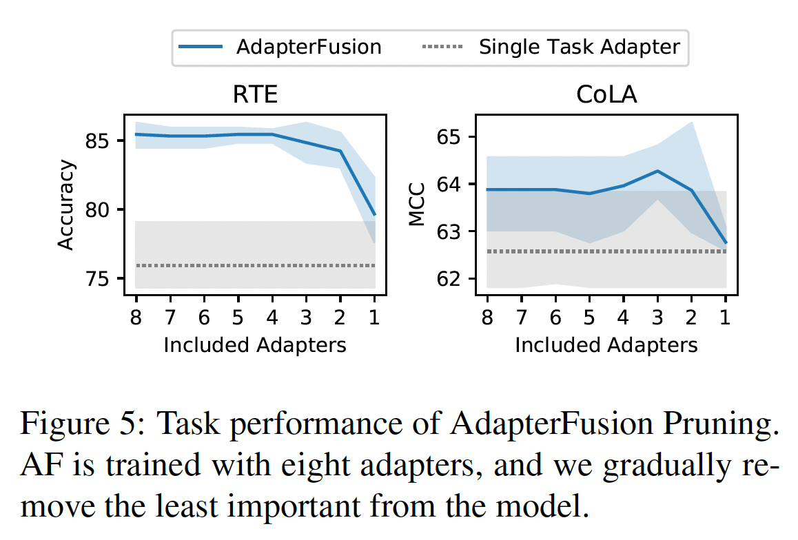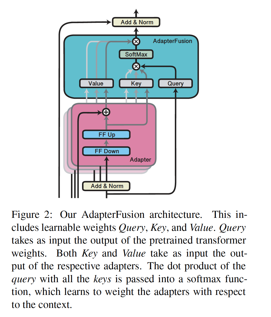 adapters 的封装迫使它们学习在任务之间兼容的 output representations 。在不同的下游任务上训练 adapters 时,它们会在指定的参数中存储各自的信息。然后可以组合多个 adapters ,例如 with attention (《AdapterFusion: Non-destructive task composition for transfer learning》)。因为各个 adapters 是分别训练的,因此由于数据集大小不均衡而产生的采样启发式规则的必要性不复存在。通过 knowledge extraction 和 knowledge composition 的分离,adapters 缓解了多任务学习的两个最常见陷阱,灾难性遗忘(catastrophic forgetting)和灾难性干扰(catastrophic interference )。