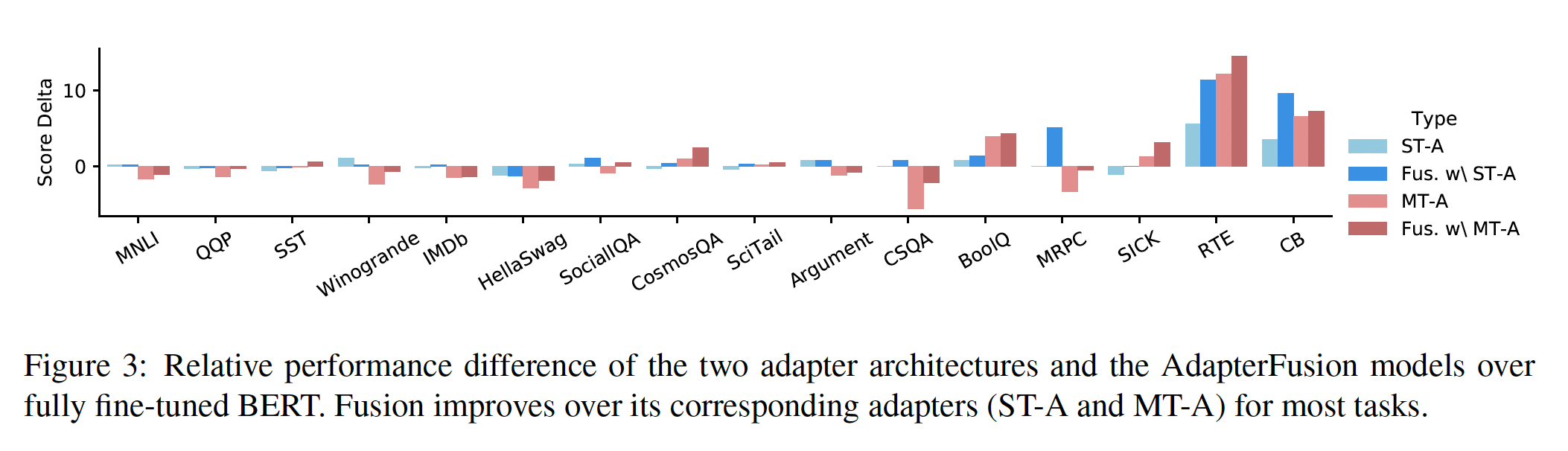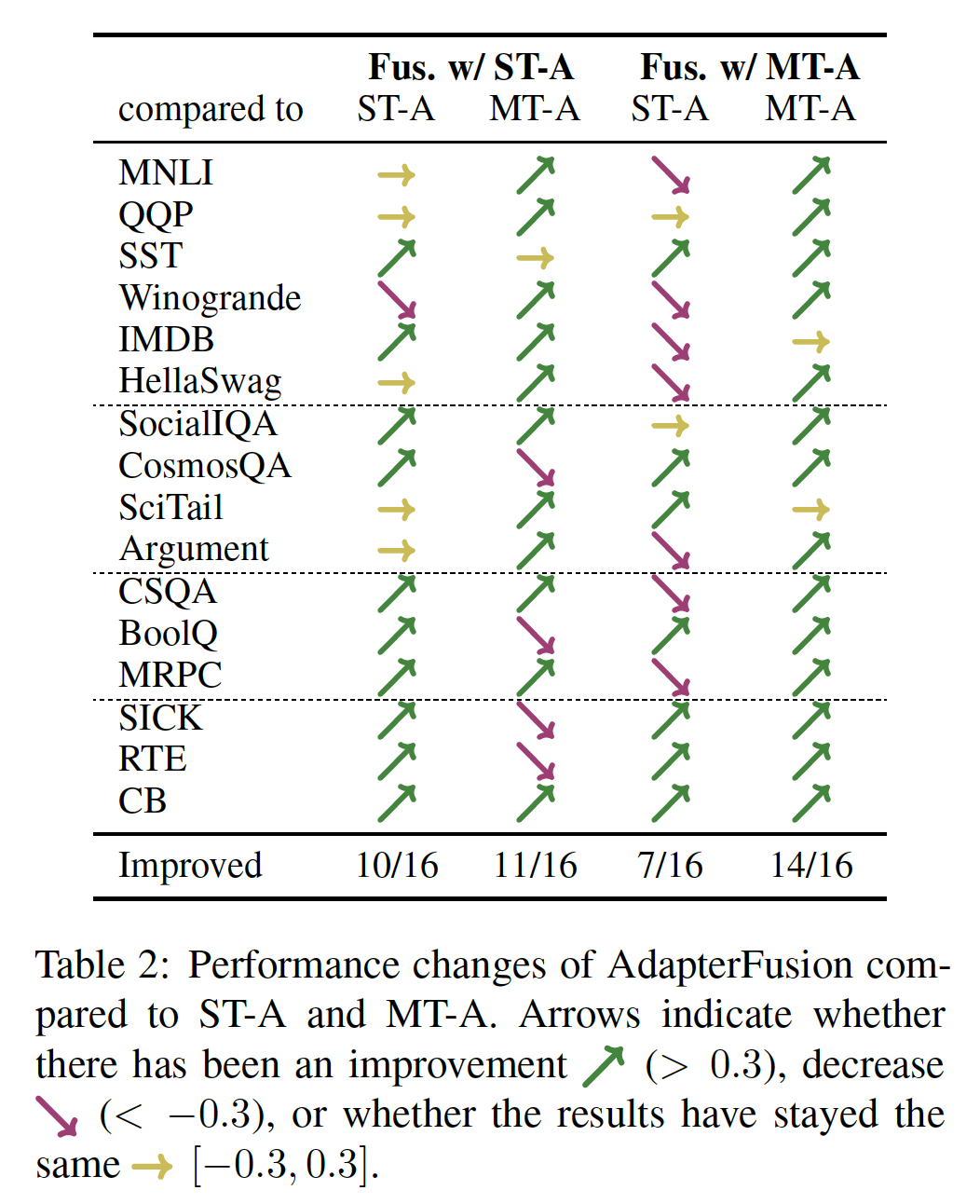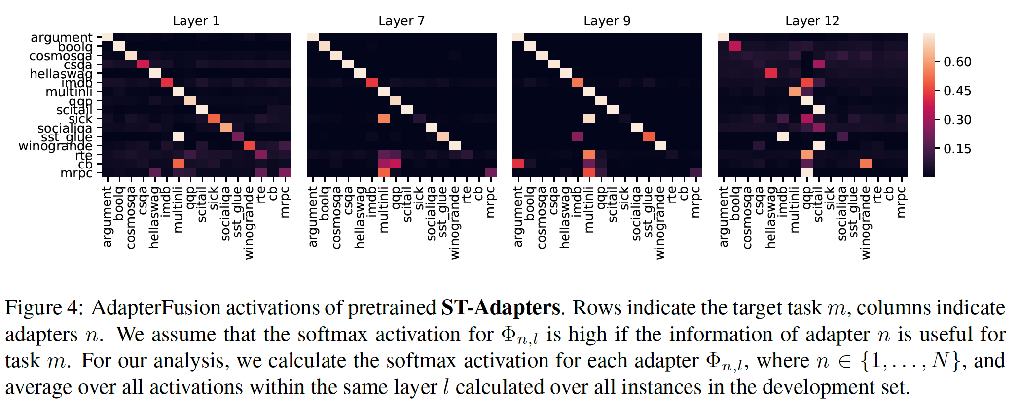 adapters 的封装迫使它们学习在任务之间兼容的 output representations 。在不同的下游任务上训练 adapters 时,它们会在指定的参数中存储各自的信息。然后可以组合多个 adapters ,例如 with attention (《AdapterFusion: Non-destructive task composition for transfer learning》)。因为各个 adapters 是分别训练的,因此由于数据集大小不均衡而产生的采样启发式规则的必要性不复存在。通过 knowledge extraction 和 knowledge composition 的分离,adapters 缓解了多任务学习的两个最常见陷阱,灾难性遗忘(catastrophic forgetting)和灾难性干扰(catastrophic interference )。