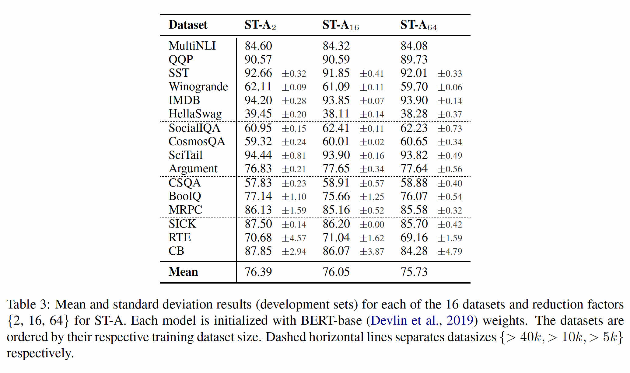 其次,我们将模型初始化为 pre-trained 模型从而用于 MRPC、RTE 和 STS-B ,而不是像 fine-tuning baseline 那样已经在 MNLI 上适配好的模型。
