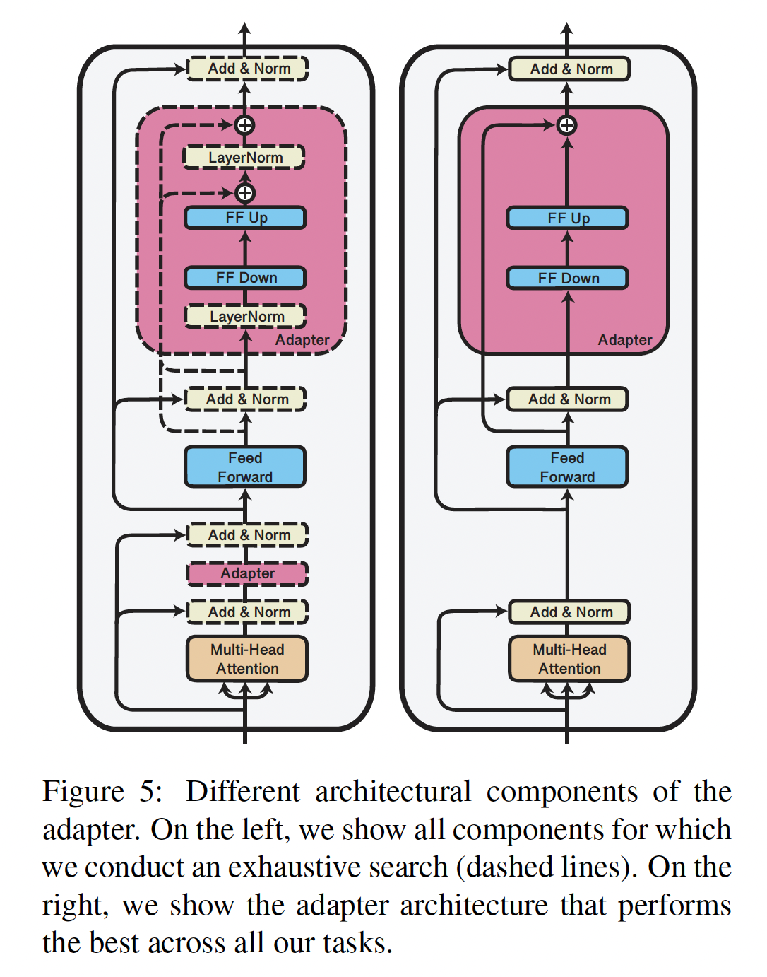最近,《Exploring versatile generative language model via parameter-efficient transfer learning》 提出了一个更高效的设计,其中 adapter layer 仅应用于 MLP 模块之后和 LayerNorm 之后。我们称之为 《Adapterfusion: Non-destructive task composition for transfer learning》 提出的另一种设计非常相似,我们称之为
