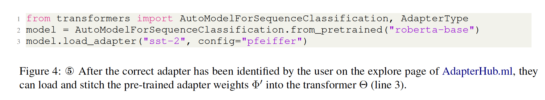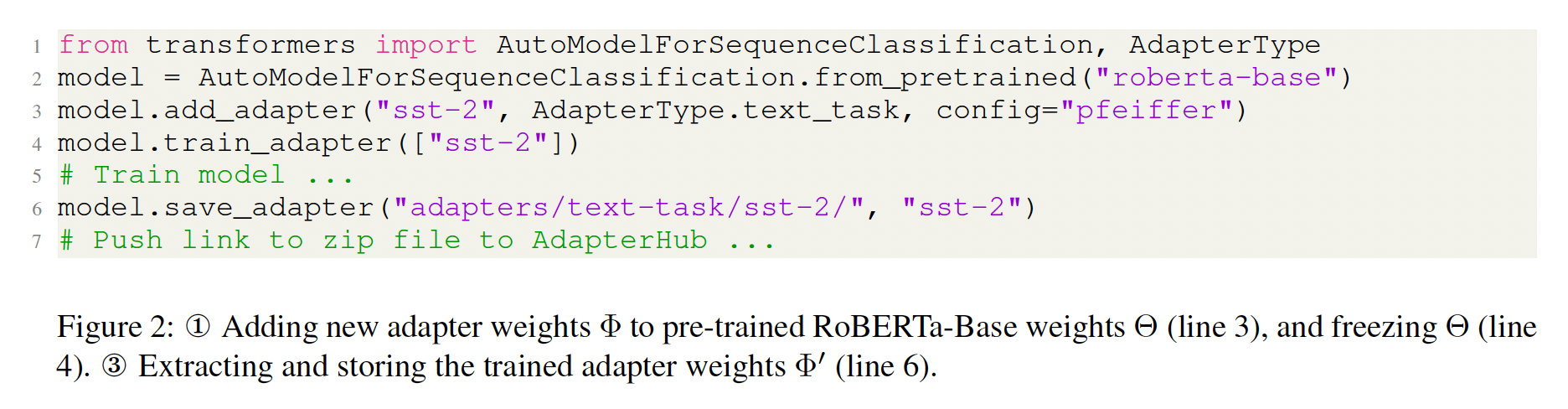⑤ Stitching-In Pre-Trained Adapters:pre-trained adapters 可以像添加随机初始化的权重一样简单地嵌入到大型transformer 模型中;这只需要一行代码,见 Figure 4 第 3 行。在网站上选择一个 adapter 时,用户将获得样例代码,对应于包含特定权重所需的配置。