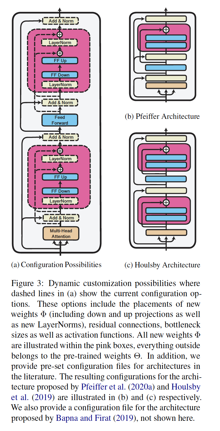 虽然我们为当前文献中的众所周知的架构提供了现成的配置文件,但 adapters 是动态可配置的,这使得可以定义大量的架构成为可能。我们在 Figure 3 中用虚线和 objects 表示可配置组件(configurable components )。可配置组件是新的权重、残差连接以及 LayerNorm layers 的 placements 。
