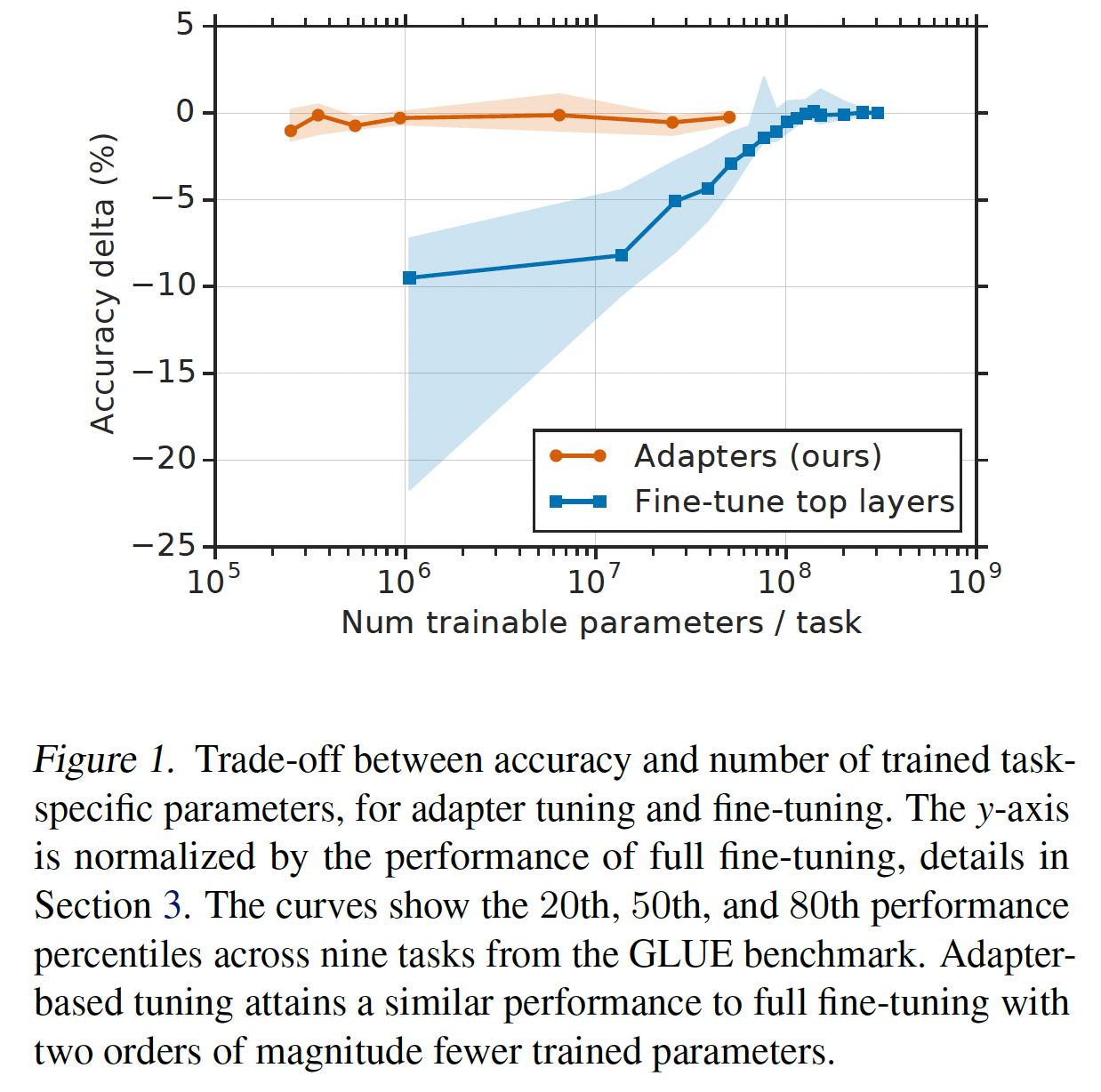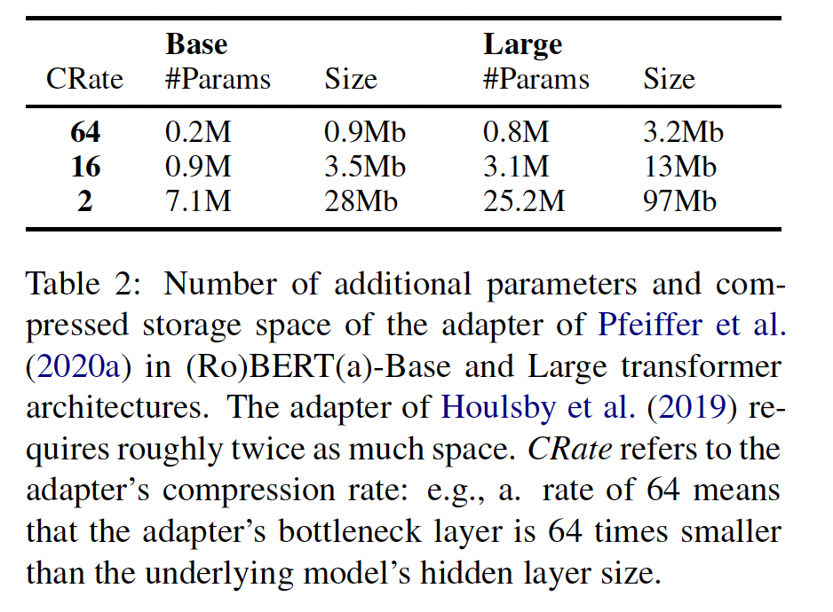 Small, Scalable, Shareable:transformer-based 的模型是具有数百万或数十亿个权重、以及大存储需求的非常深的神经网络;例如,XLM-R Large 需要约 2.2Gb 的压缩存储空间。为每个任务独立地 fully fine-tuning 这些模型需要存储每个任务微调后的模型的副本。这阻碍了训练的迭代和并行化,特别是在存储受限的环境中。