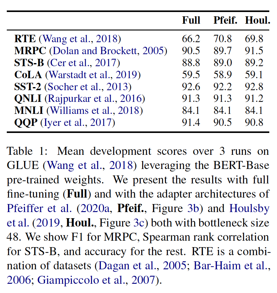 Task-specific Layer-wise Representation Learning:在引入 adapters 之前,为了在下游任务上获得 SOTA 性能,需要对整个 pre-trained transformer model 进行微调。已经证明 Adapters 可以与 full fine-tuning 媲美,通过在每一层适配 representations 。我们在 Table 1 中展示了在 GLUE benchmark 上 fully fine-tuning 模型,以及如下两个不同的 Adapter 架构的结果: