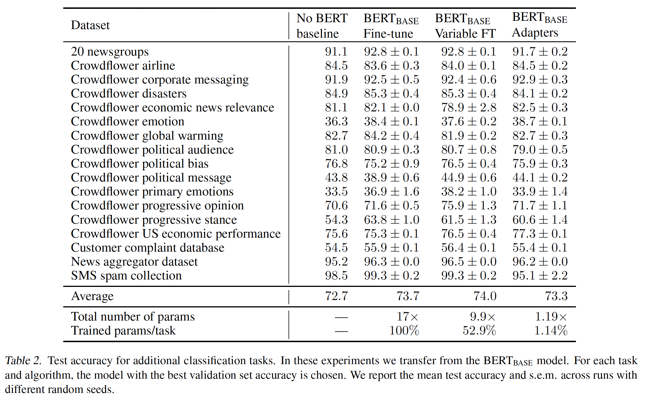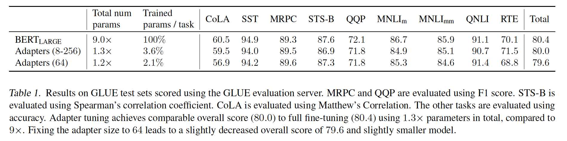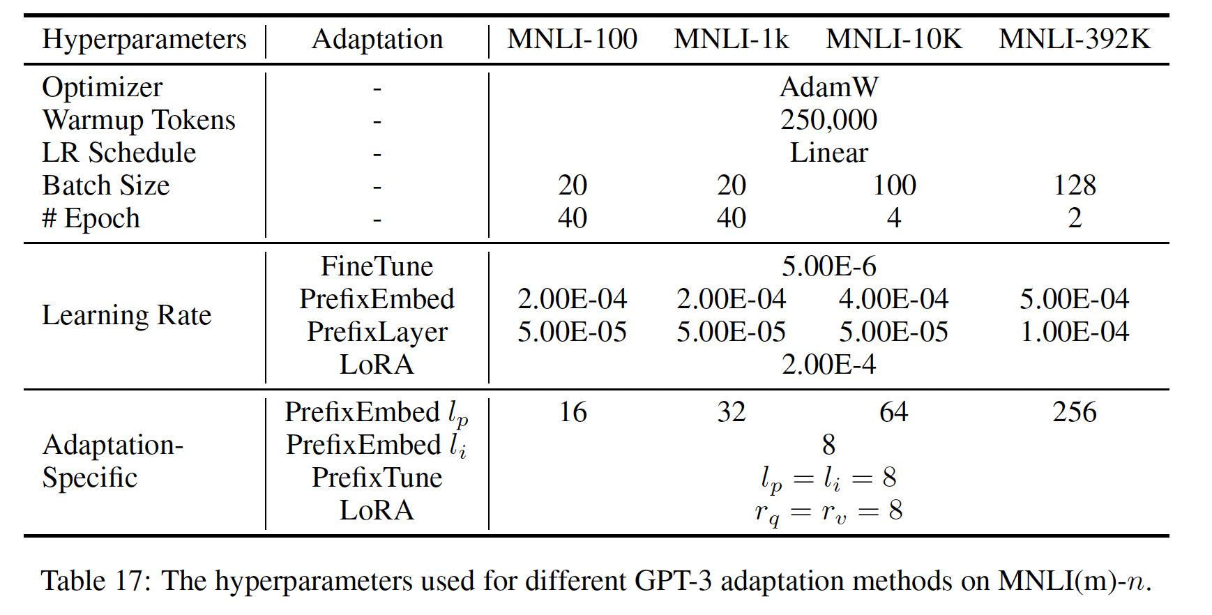 遵循 《Parameter-Efficient Transfer Learning for NLP》 更严格设置的 runs 用 Table 2 所示(前三部分)。附录 D.1 节详细介绍了所使用的超参数。