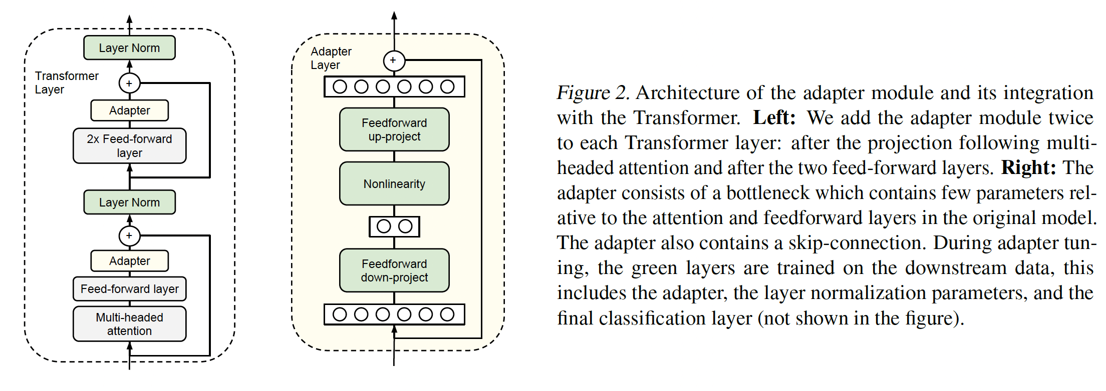 《Parameter-efficient transfer learning for NLP》 (Figure 3c):在每个 transformer layer 中包含两个 adapters 。