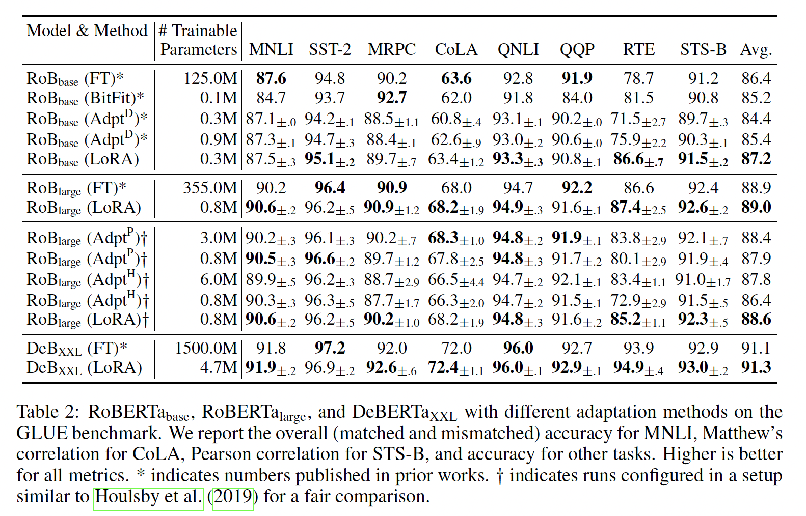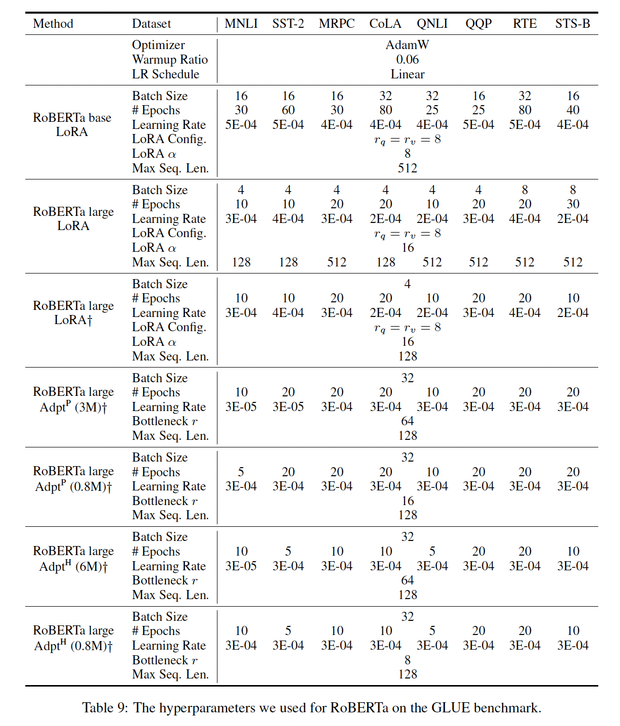 RoBERTa base/large:RoBERTa 优化了 BERT 最初提出的预训练配方,在不引入更多可训练参数的情况下提升了后者的任务性能。尽管近年来 RoBERTa 在 GLUE 等 NLP 排行榜上被更大的模型超过,但它仍然是一个流行的、有竞争力的 pre-trained 模型。我们从 HuggingFace Transformers 库获取 pre-trained RoBERTa base (125M) 和 RoBERTa large (355M) ,并评估不同 efficient adaptation 方法在 GLUE 任务上的性能。我们还根据他们的设置复制了 《Parameter-Efficient Transfer Learning for NLP》 和 《Adapterfusion: Non-destructive task composition for transfer learning》的工作。为了确保公平比较,我们在与 adapters 比较时,在如何评估 LORA 上做了两个关键更改: