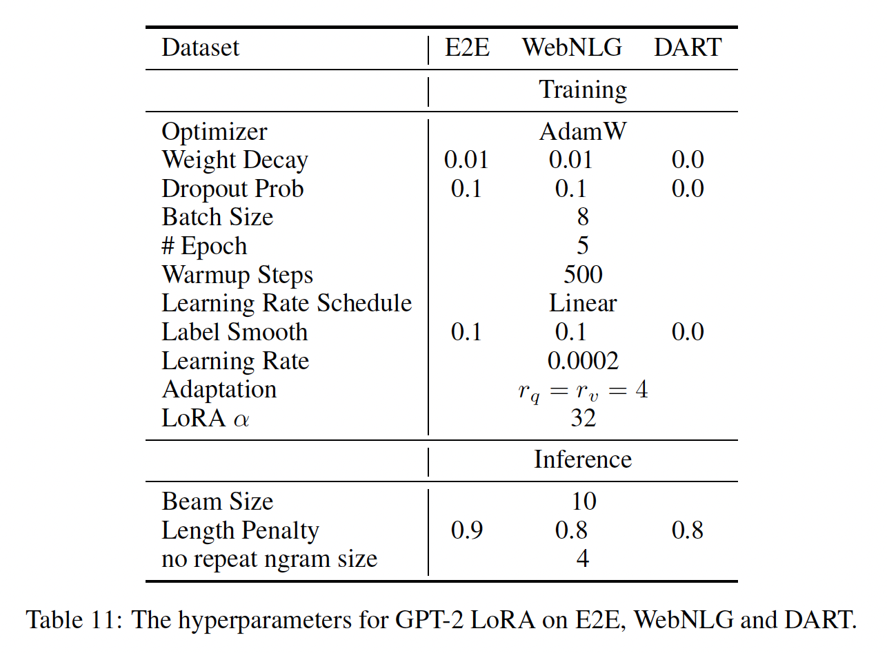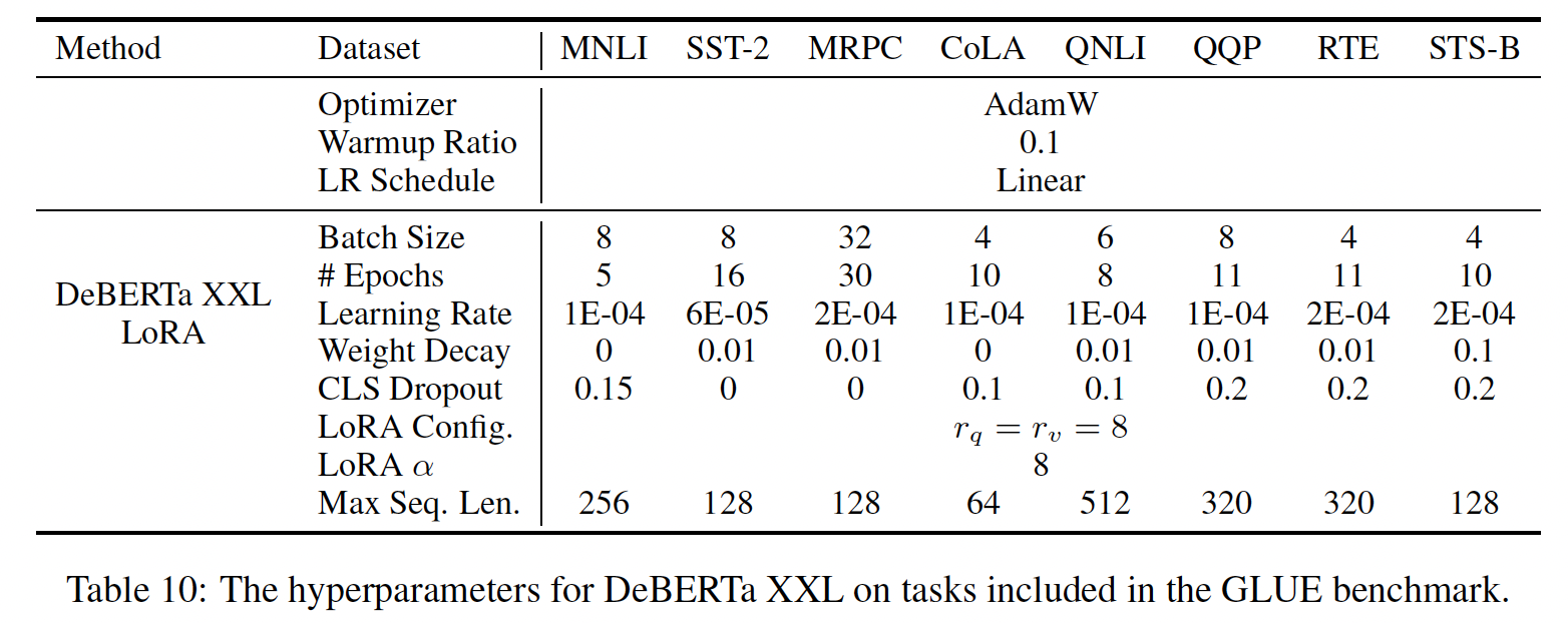 DeBERTa XXL:DeBERTa 是最近的 BERT 变体之一,它以更大的规模进行了训练,在 GLUE 和 SuperGLUE 等 benchmarks 中表现非常有竞争力。我们评估 LORA 是否仍然可以在 GLUE 上匹配 fine-tuned DeBERTa XXL (1.5B) 的性能。结果如 Table 2 最后一部分所示。附录 D.2 节详细介绍了所使用的超参数。