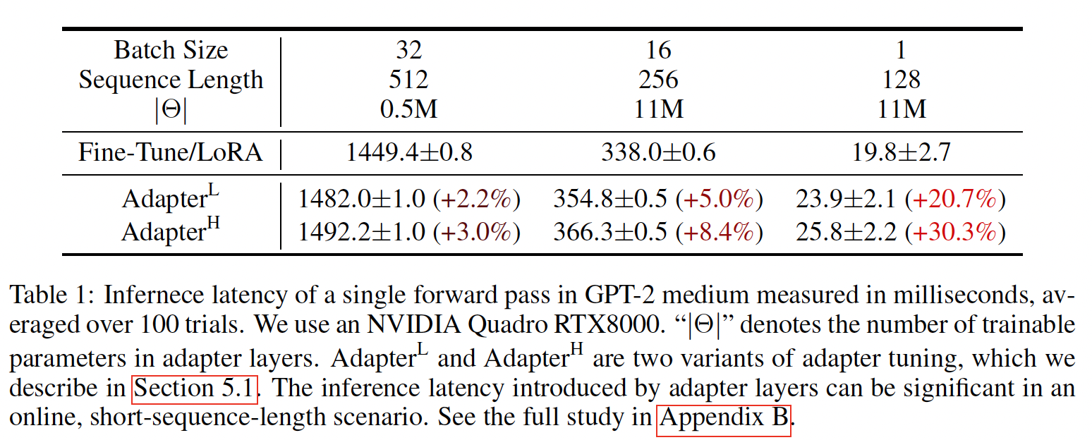 Adapter Layers Introduce Inference Latency:adapters 有许多变体。我们关注 《Parameter-Efficient Transfer Learning for NLP》 的原始设计,每个 Transformer block 有两个 adapter layers ;以及 《Exploring versatile generative language model via parameter-efficient transfer learning》 的更近期设计,每个 block 仅有一个 adapter layer,但具有额外的 LayerNorm 。尽管可以通过裁剪 layers 、或利用多任务设置来减少整体延迟(《Adapterdrop: On the efficiency of adapters in transformers》、《Adapter-fusion: Non-destructive task composition for transfer learning》),但是没有直接的方法可以绕过 adapter layers 中的额外计算。这似乎不是问题,因为 adapter layers 通过具有小的 bottleneck 维度来被设计为参数很少(有时是原始模型的 <1% ),这限制了它们可以添加的 FLOPs 。但是,大型神经网络依赖硬件并行性来保持低延迟,而 adapter layers 必须串行地处理。这在 batch size 通常为 1 的在线推理设置中会造成区别。在没有模型并行的通用场景中,例如在单 GPU 上运行 GPT-2 medium 的推理,即使使用了非常小的 bottleneck 维度,当使用 adapters 时,我们也看到显著的延迟增加(Table 1 )。
