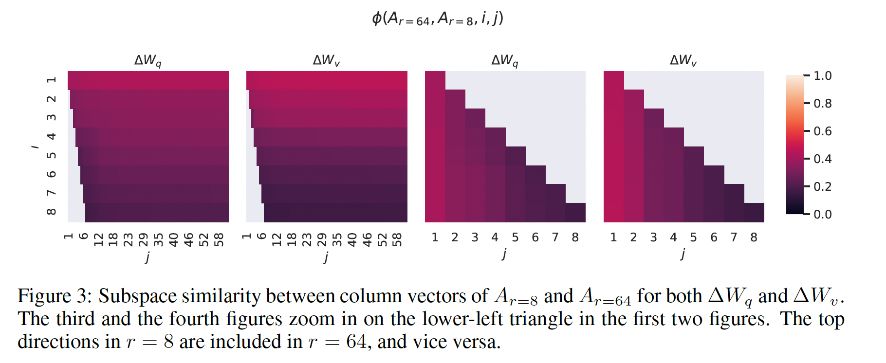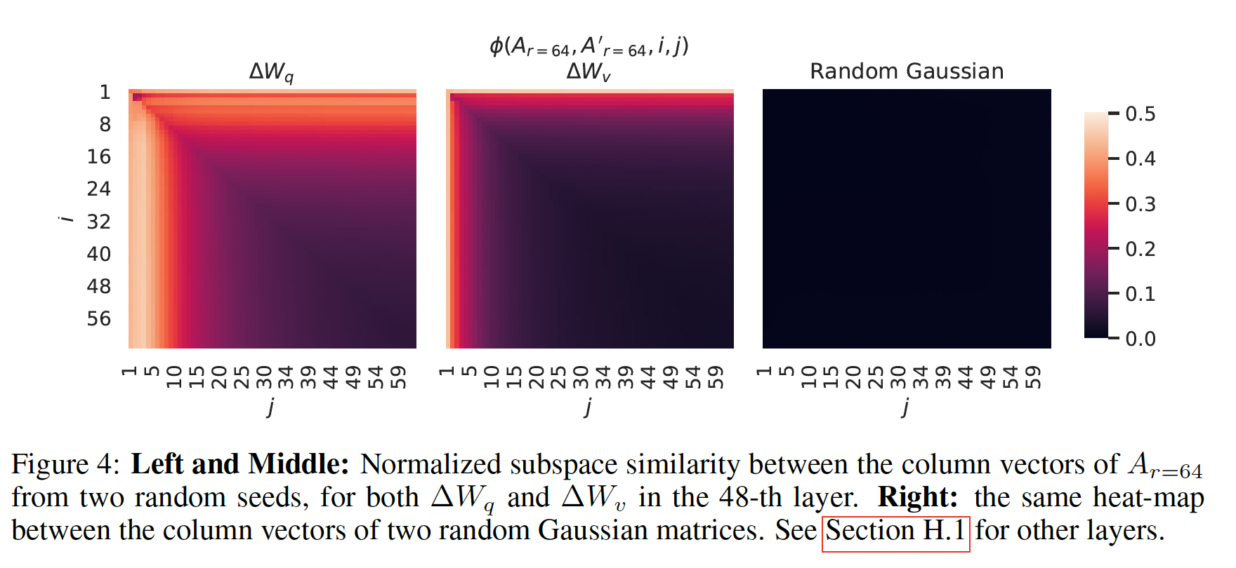 从 Figure 3 我们可以得到一个重要观察:对于 top singular vector 的方向重叠显著,而其他 singular vector 不重叠。 具体来说,对于 0.5 。对于 GPT-3 下游任务中的表现相当不错。