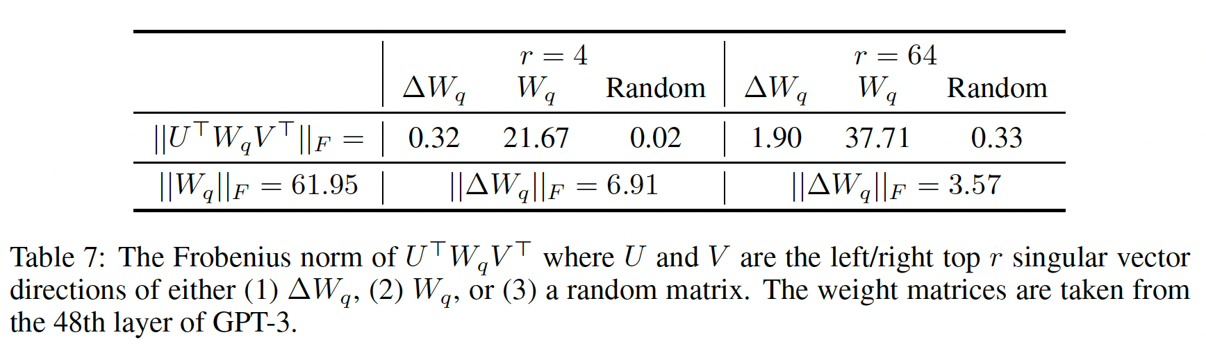 由于 pre-trained 模型学习的,Figure 3 表明 top singular-vector 方向是最有用的,而其他方向可能主要包含训练过程中累积的随机噪声。因此,adaptation matrix 确实可以具有非常低的秩。