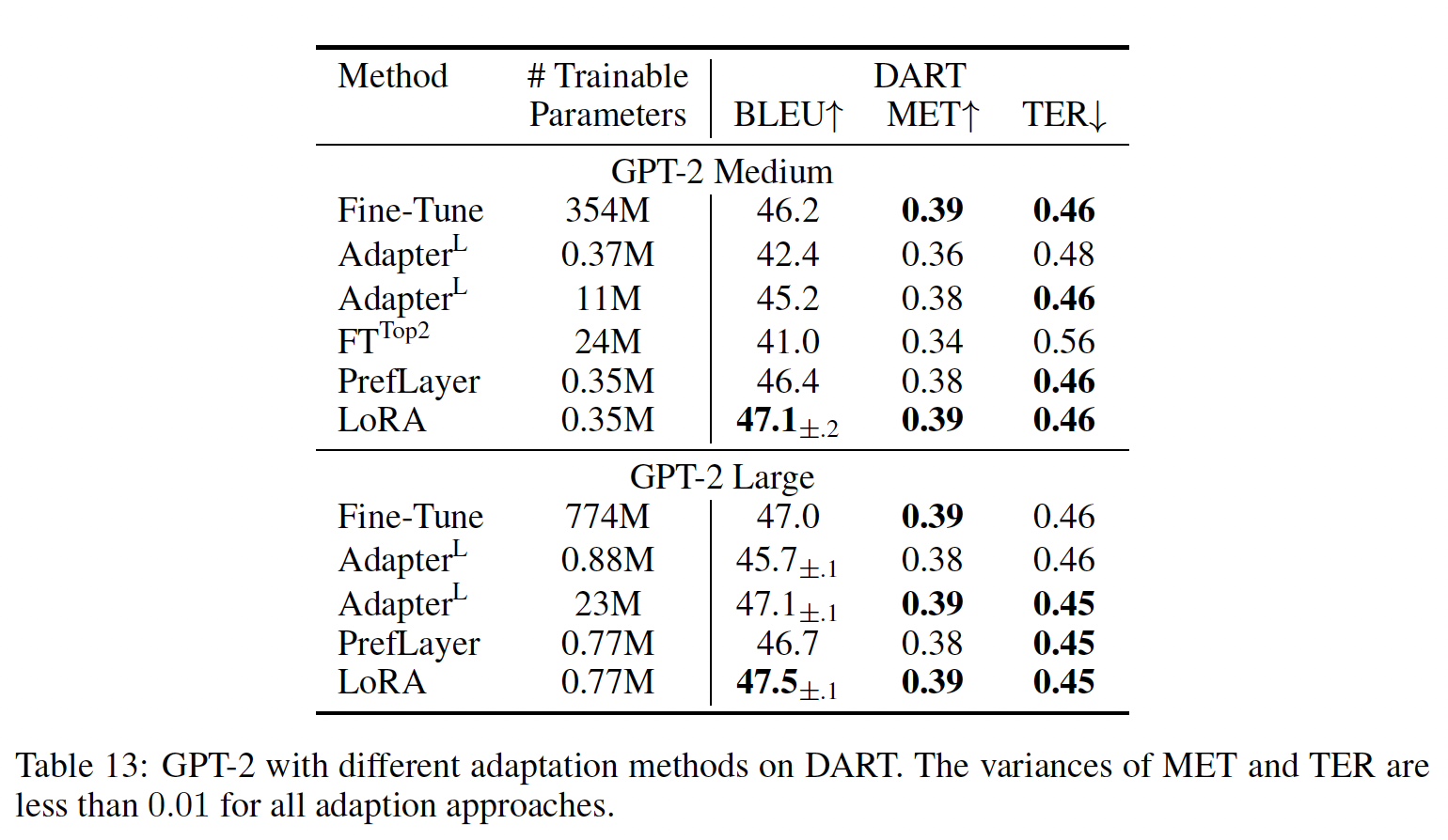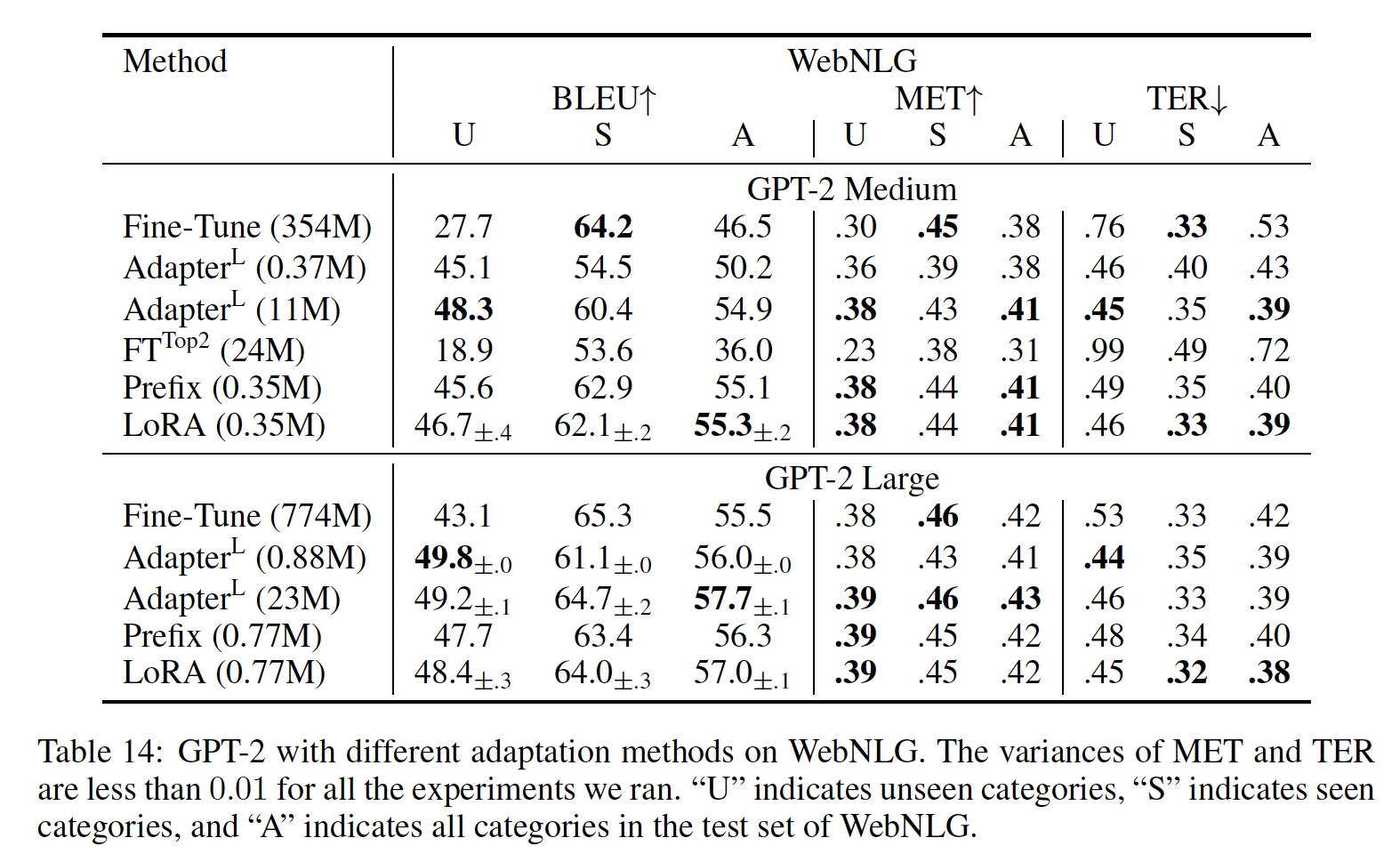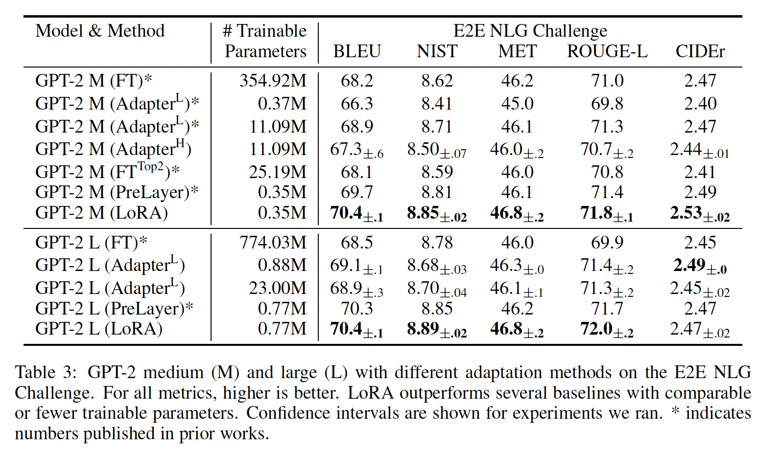 GPT-2 medium/large:在展示 LORA 可以在自然语言理解任务上成为 full fine-tuning 的有竞争替代方案之后,我们希望回答LORA 是否仍然在 NLG 模型上也占优势,例如 GPT-2 medium 和 GPT-2 large 。我们使我们的设置尽可能接近 《Prefix-Tuning: Optimizing Continuous Prompts for Generation》 的设置,以进行直接比较。由于版面限制,我们在本节中仅展示 E2E NLG Challenge 数据集上的结果(见 Table 3 。第 F.1 节给出了 WebNLG 和 DART 的结果。第 D.3 节列出了使用的超参数。