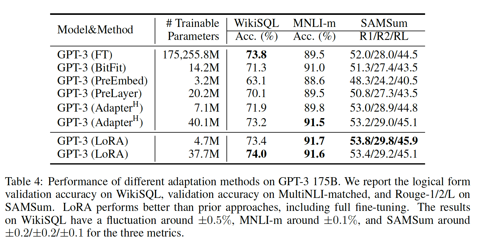 扩展到 GPT-3 175B :作为 LORA 的最终压力测试,我们扩展到拥有 175B 参数的 GPT-3 。由于训练成本很高,对于给定的任务,我们仅报告在不同随机种子上的典型标准差,而不是为每个随机数提供一个标准差。第 D.4 节详细介绍了所使用的超参数。