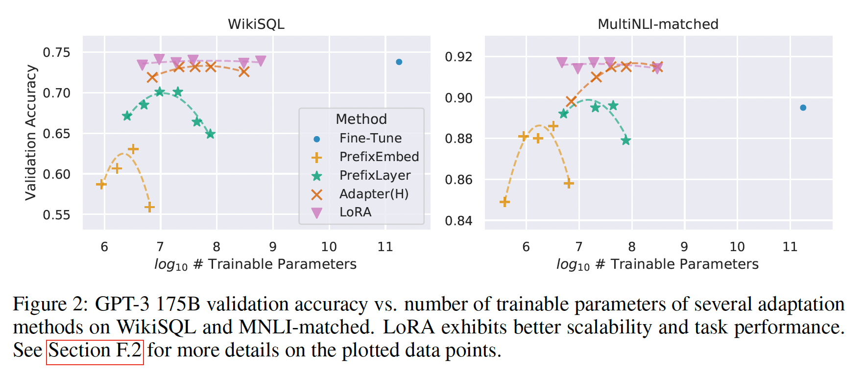 如 Table 4 所示,LORA 与 fine-tuning baseline 的性能相当或更好。请注意,并非所有方法都会从有更多可训练参数中受益,如 Figure 2 所示。当使用超过 256 special tokens 进行 prefix-embedding tuning 、或超过 32 special tokens 进行 prefix-layer tuning 时,我们观察到显著的性能下降。这证实了 《Prefix-Tuning: Optimizing Continuous Prompts for Generation》 的类似观察。尽管本文不打算深入研究这种现象,但我们怀疑使用更多 special tokens 会使输入分布进一步偏离 pre-training data distribution 。另外,我们在第 F.3 节中研究了不同适配方法在数据量少的情况下的表现。