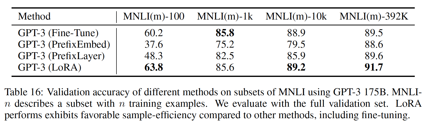 adapter 的一个同期扩展是 COMPACTER (《Compacter: Efficient low-rank hypercomplex adapter layers》),它本质上是参数化 adapter layers ,使用具有某些 predetermined 的权重共享方案的 Kronecker products 。类似地,将 LORA 与其他 tensor product-based 积的方法相结合,可能会潜在地改善其参数效率,我们留待未来研究。