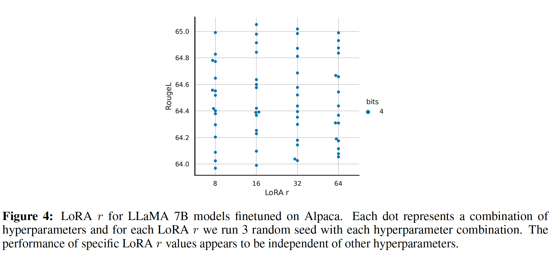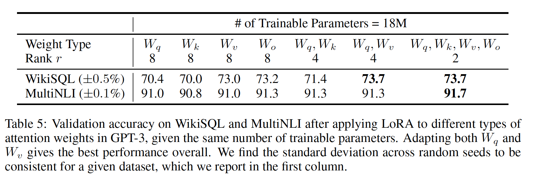 请注意,将所有参数预算放在 rank 来适配单个权重相比,适配更多个的权重矩阵更可取。